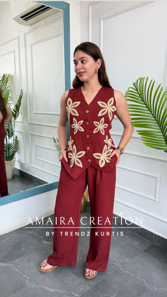 Premium Wine Crepe Fabric Beautiful Thread Work Cord Set