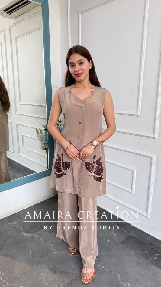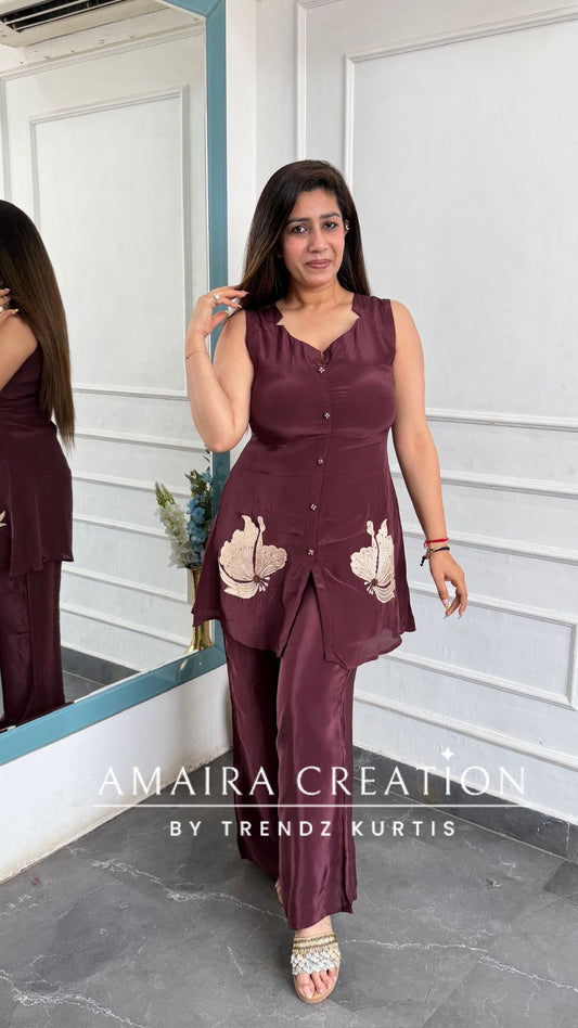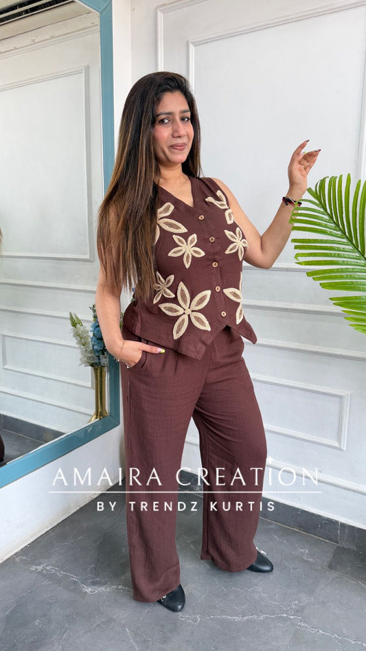 Muslin Fabric Coffee Color Thread Embroidered Pant Set