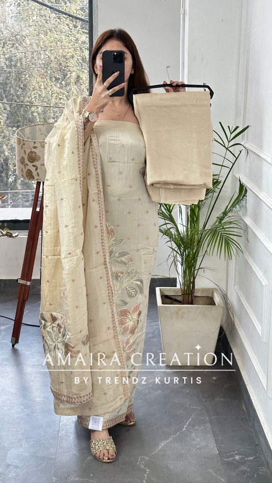 Premium Glass Tissue Cream Color Unstitched Suit With Chiffon Dupatta