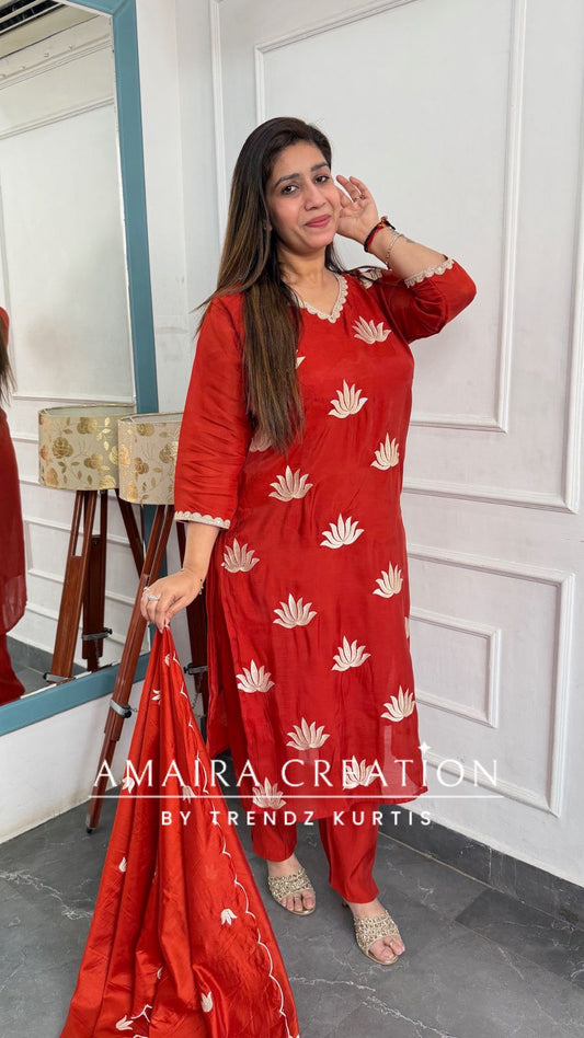 Muslin Fabric Rust Color Thread Embroidered Pant Set