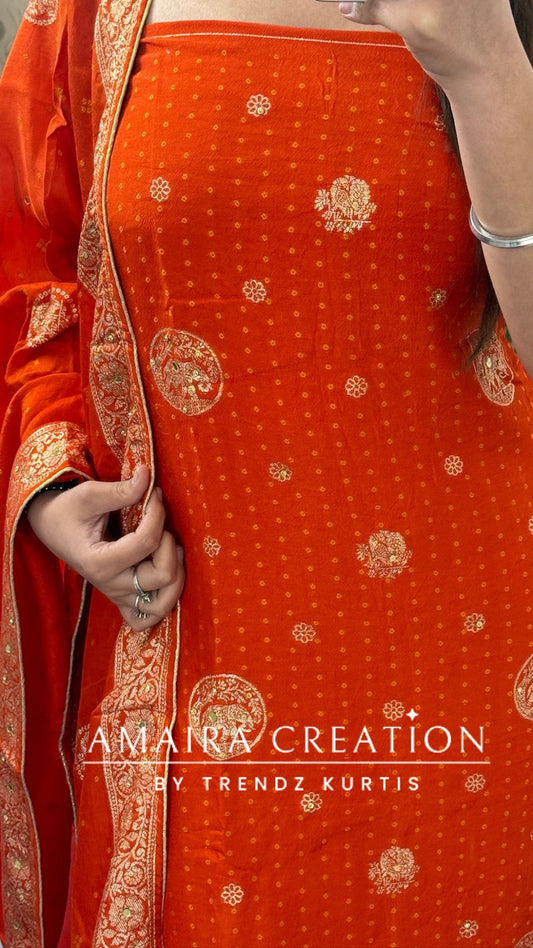 Premium Orange Banarasi Silk Bandez Print Unstitched Suit With Beautiful Banarasi Dupatta