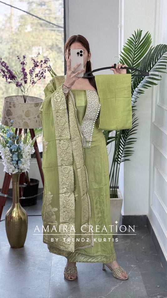 Premium sea green Glass Tissue Unstitched Suit With Original Mirror Work Neckline Detailing With Super Banarasi Tissue Dupatta