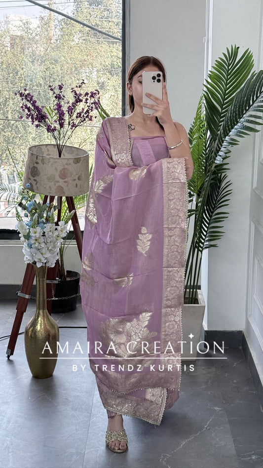 Premium Mauve Glass Tissue Unstitched Suit With Original Mirror Work Neckline Detailing With Super Banarasi Tissue Dupatta