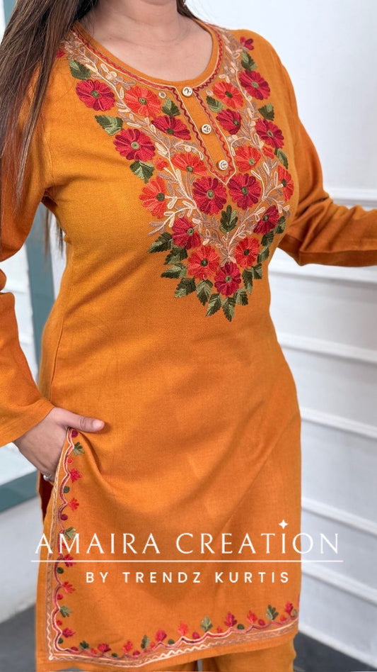 Premium Woolen Mustard Colour Kashmiri Work Pheran Set