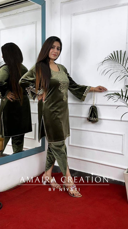 Premium Cauterised Woolen Olive Green Embroidery Cord set