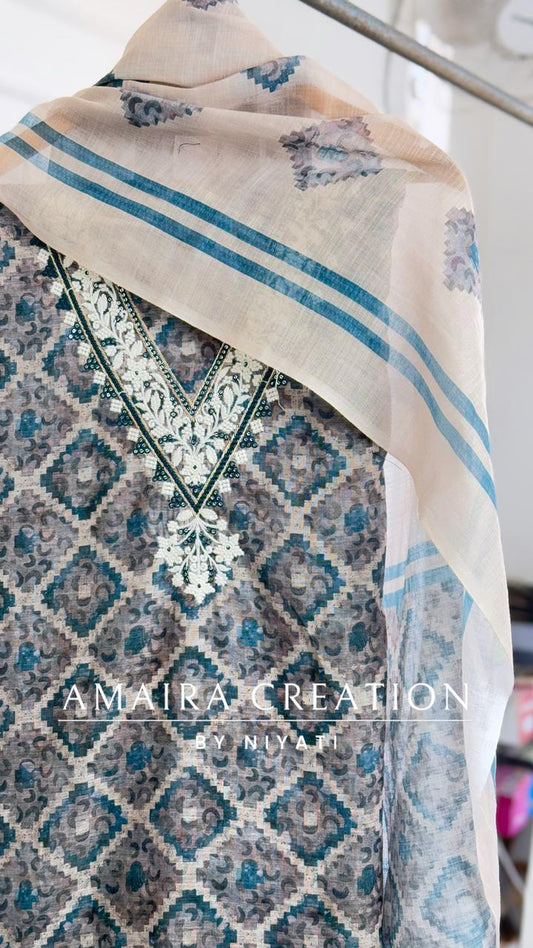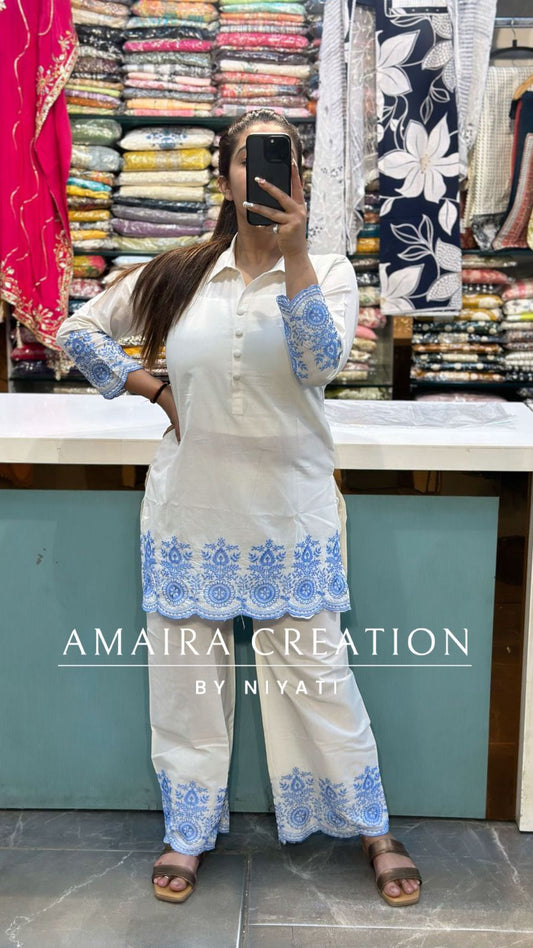 Mul Cotton White Color Sky Blue Thread Embroidery Cord Set(Full Cotton Lining)