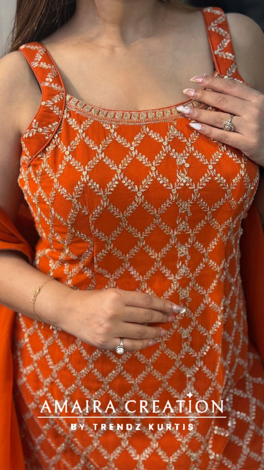 Premium Glass Tissue Rust Zari Work Unstitched Set