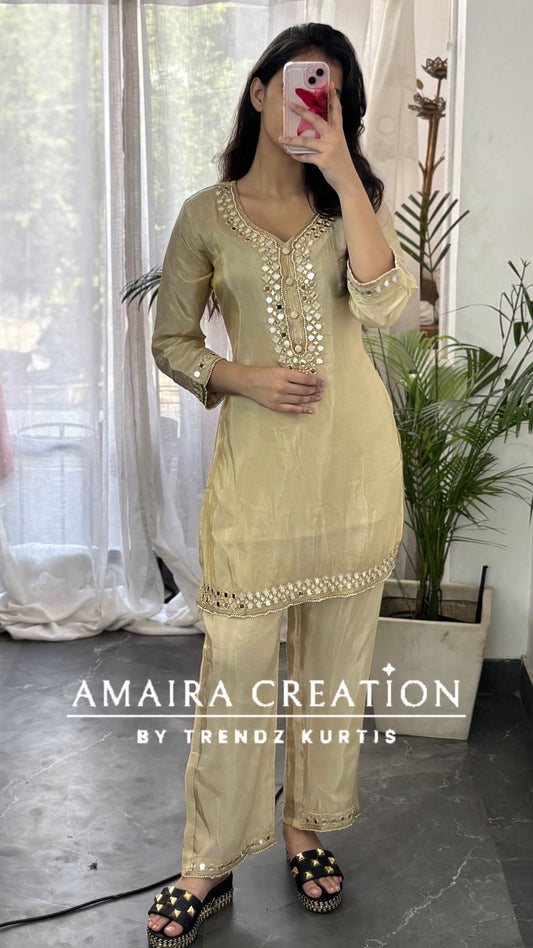 Premium Glass Tissue Cream Colour Mirror Work Cord Set