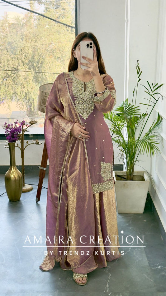 Premium Lavender Glass Tissue Fabric Fully Hand Work Centre Slit Pant Set.