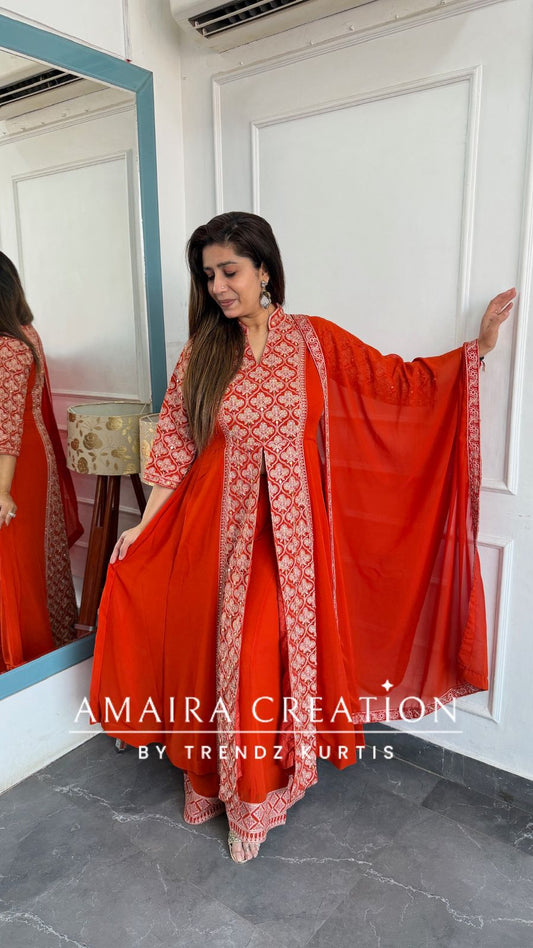 Premium Georgette Fully Work Rust Colour Centre Slit Plazo Set