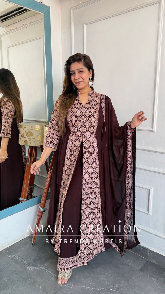 Premium Georgette Fully Work Brown Colour Centre Slit Plazo Set
