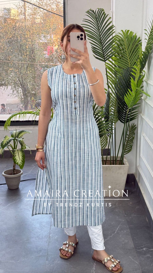 Premium Cotton White Blue Stripe Pattern Kurti (17 inches sleeves available)