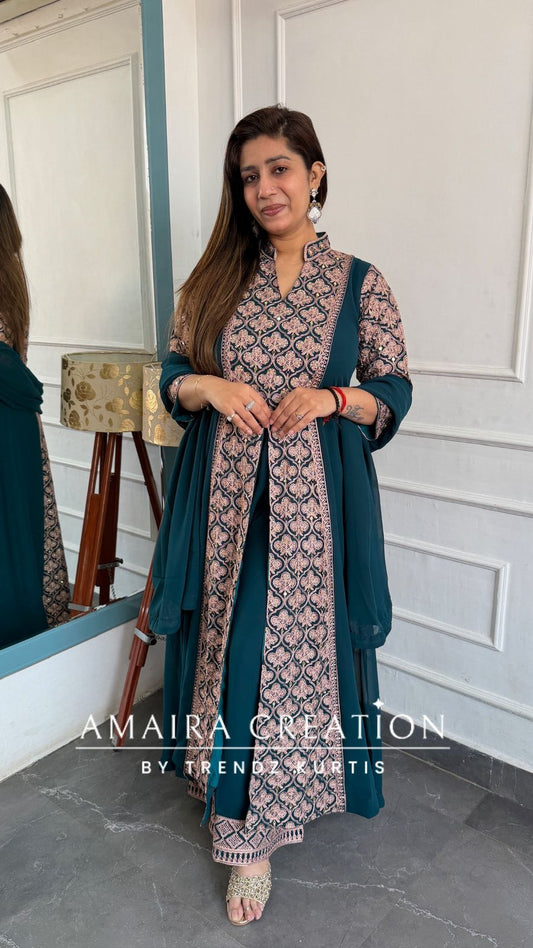 Premium Georgette Fully Work Teal Green Colour Centre Slit Plazo Set