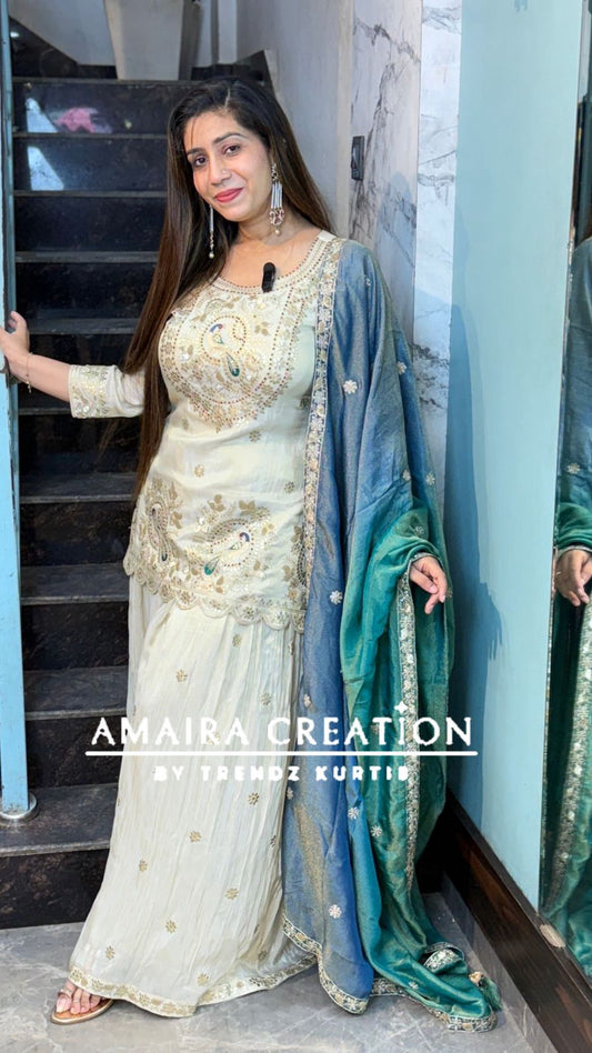 Premium Chinnon Strap Pattern Sharara Set (17 inches sleeves available)