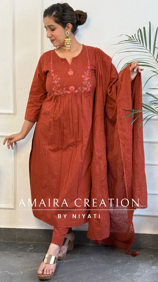 Orange Color Cotton A Line Thread Embroidery Pant Set