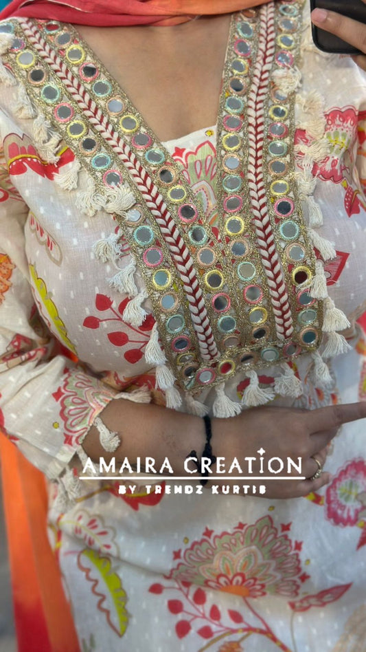 Premium Glass Tissue Cream Colour Mirror Work Cord Set