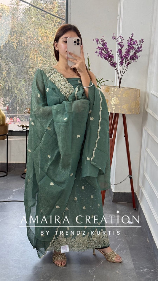 Premium Shimmer Silk Sea Green Color Sequin Emblishment Unstitched Suit