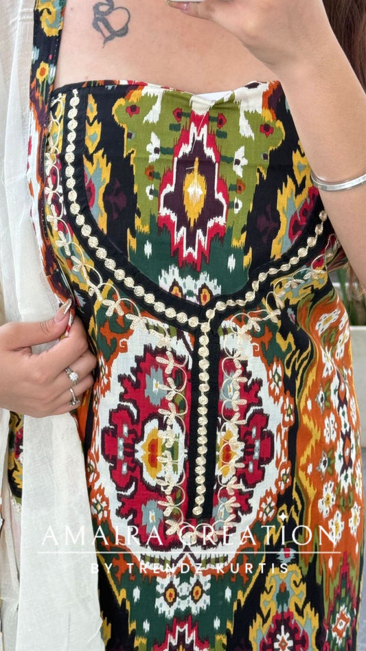 • Premium Cotton Ikkat Print Black Colour Unstitched Suit