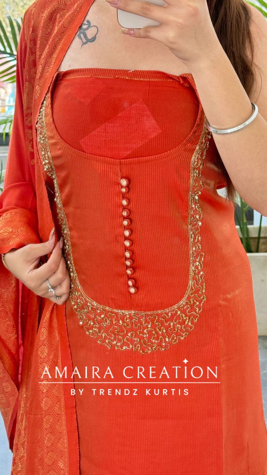 Premium Organza Fabric Copper Colour Beautiful Thread Embroidered Zari Work Unstitched Suit