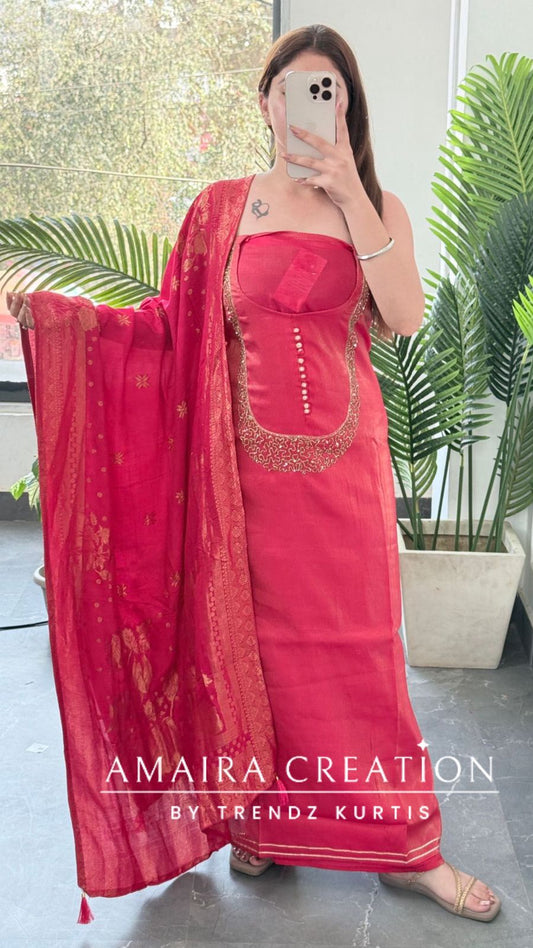 • Premium Wine Shimmer Tissue Embroidered Unstitched Suit With Beautiful Dupatta