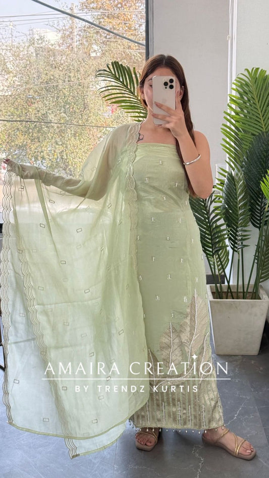 • Premium Organza Fabric Pista Colour Beautiful Thread Embroidered Zari Work Unstitched Suit