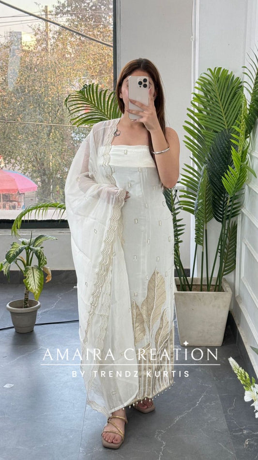• Premium Crepe Ivory Colour Champagne Gold Leaf Applique Pearl Work With Organza Dupatta