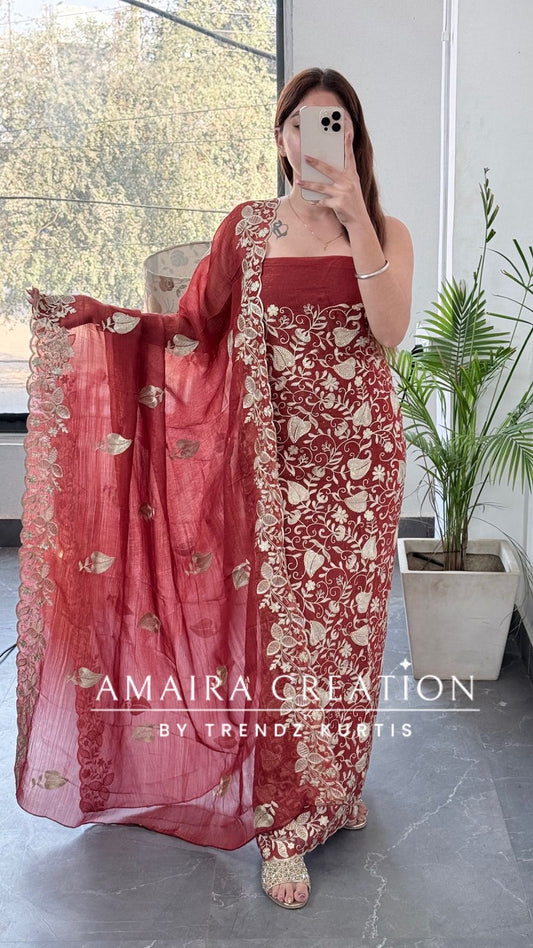 Premium Glass Tissue Rust Zari Work Unstitched Set