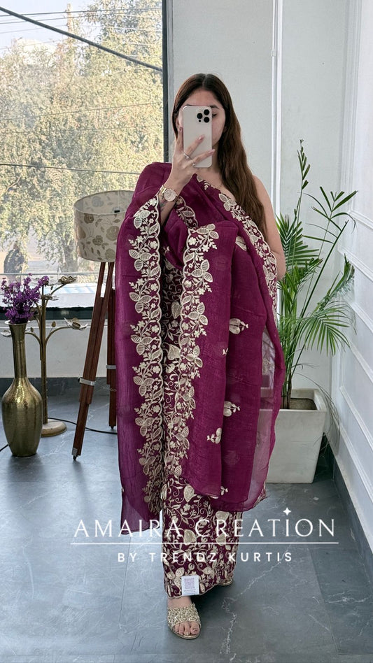Premium Glass Tissue Wine Zari Work Unstitched Set