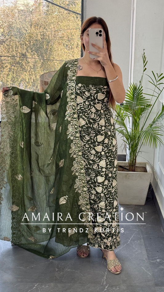 Premium Glass Tissue Green Zari Work Unstitched Set