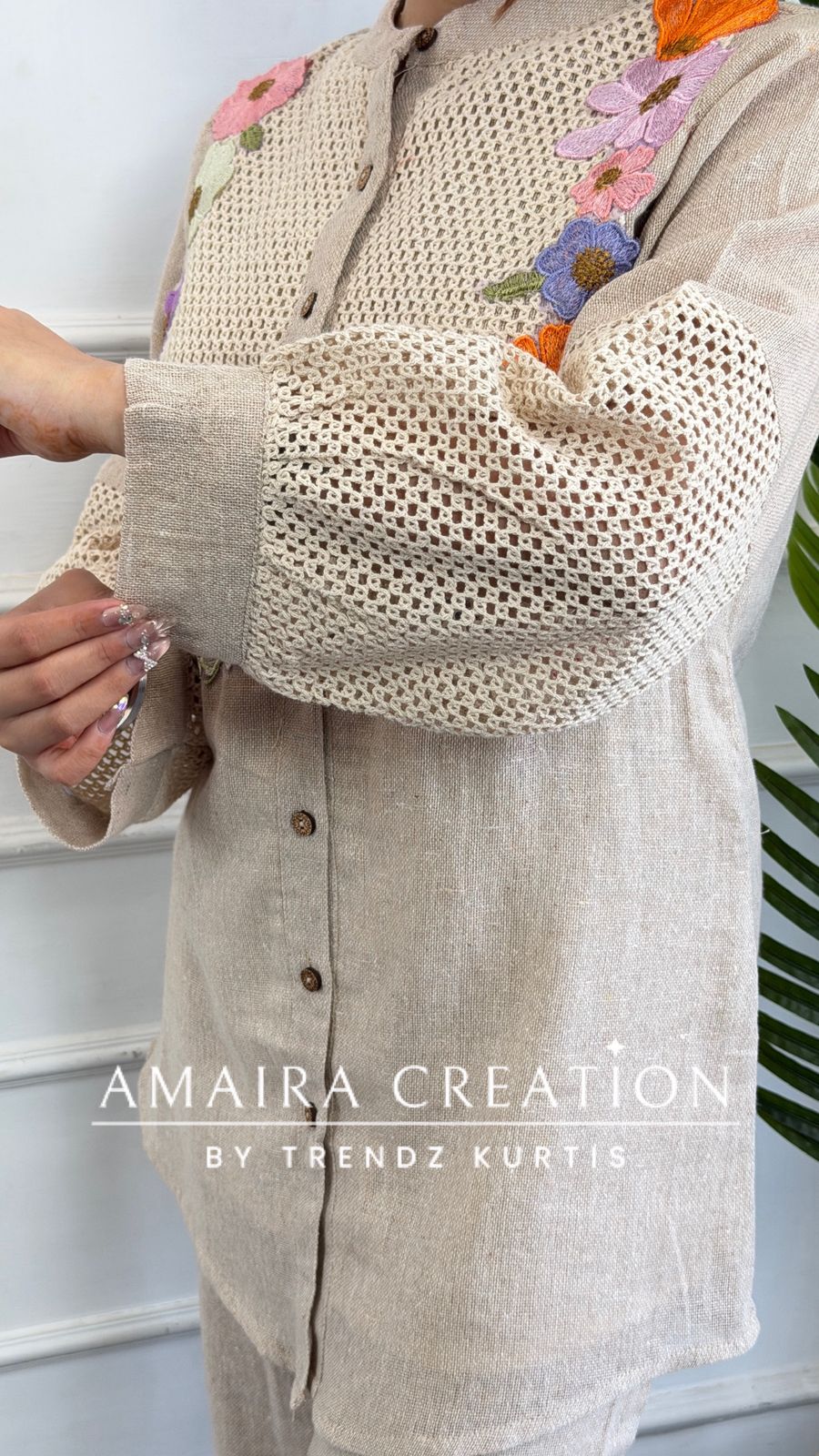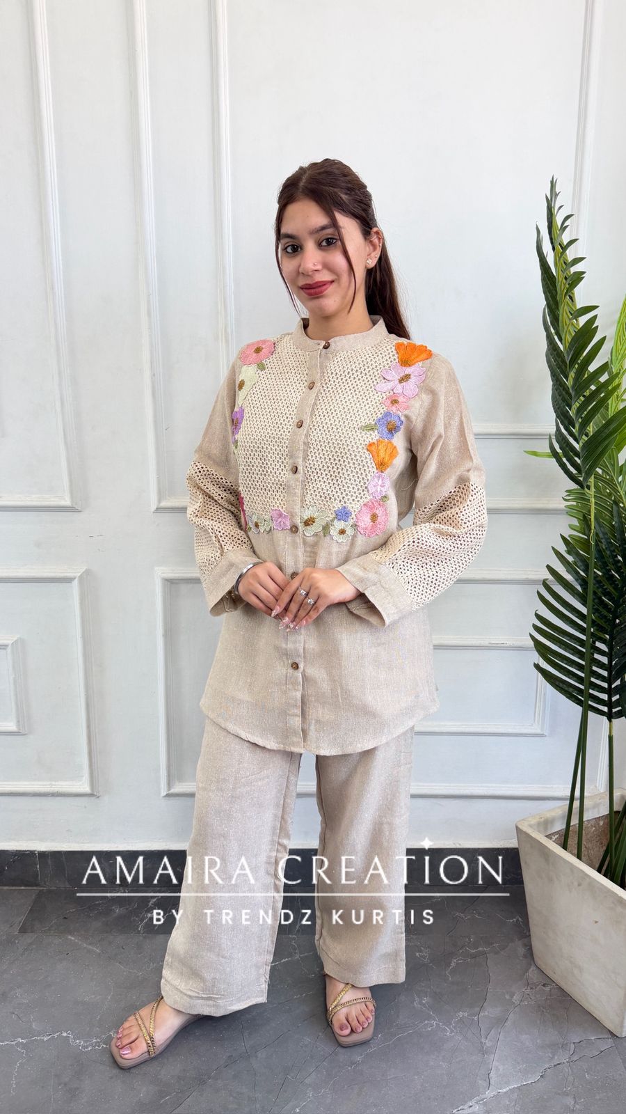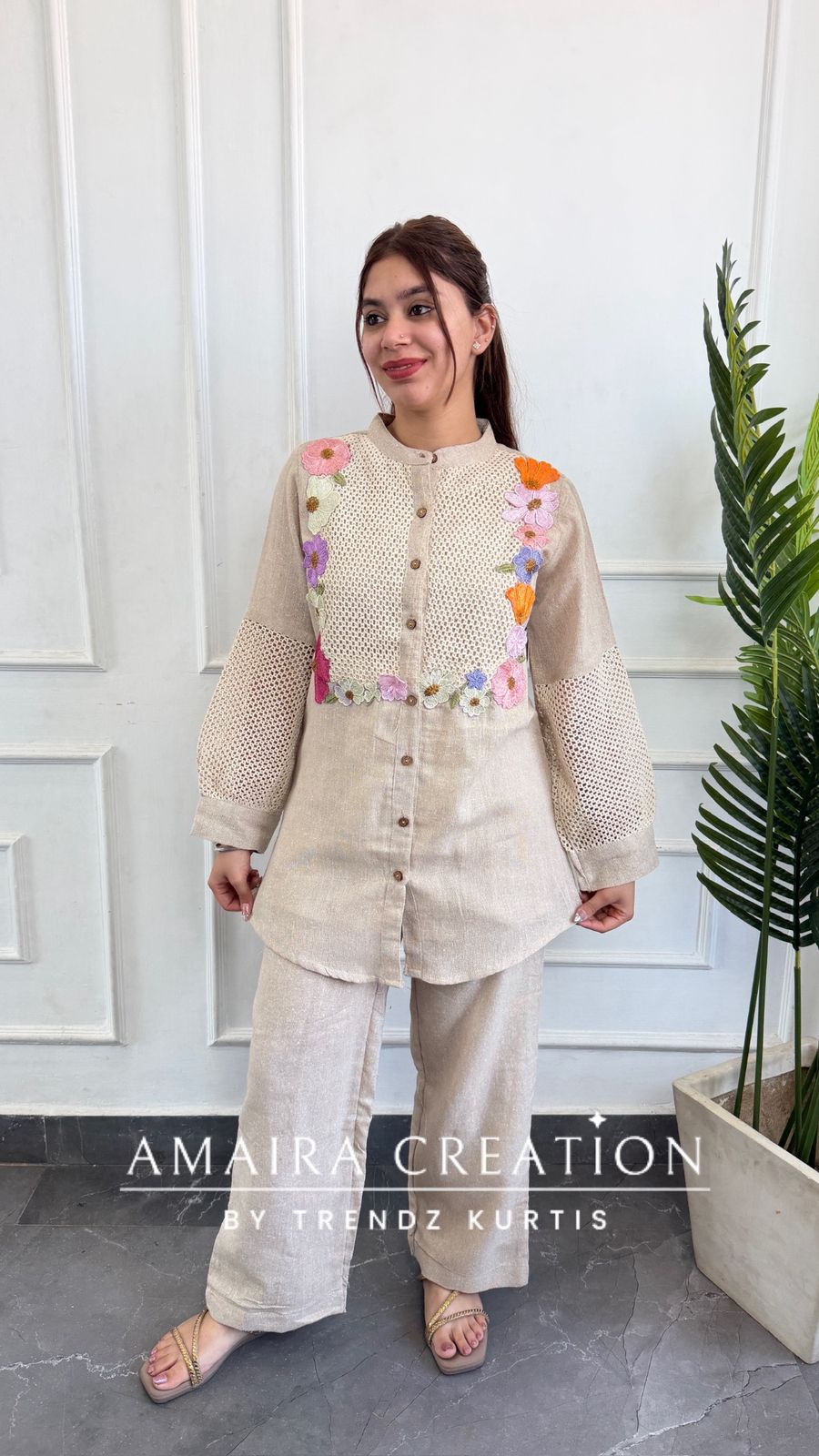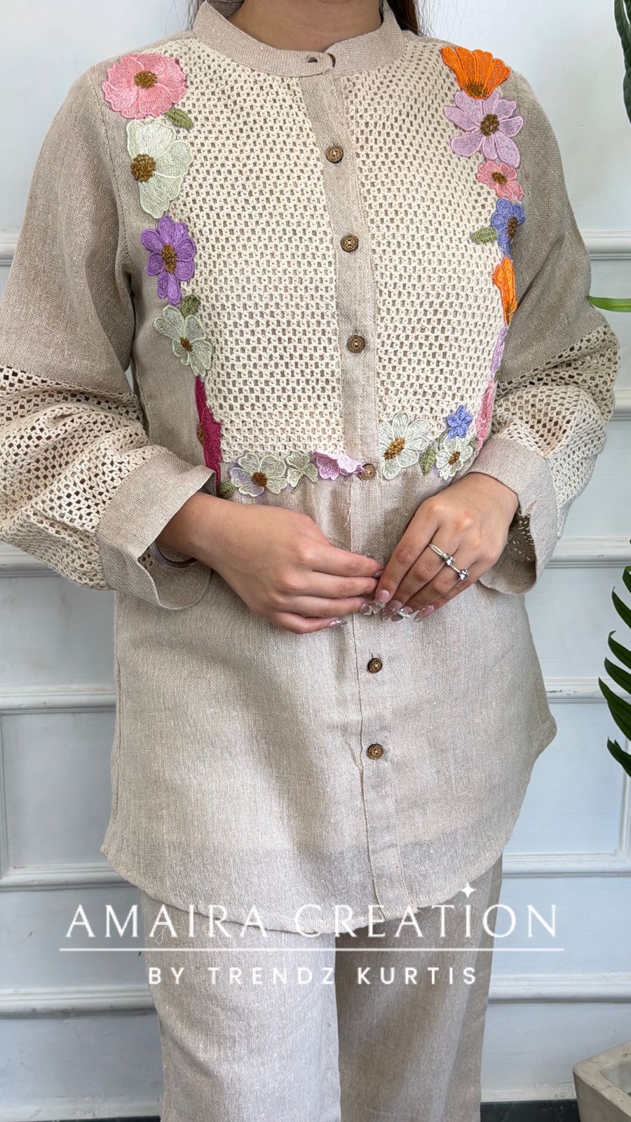 - Design: A chic mandarin-collar shirt-style co-ord set featuring a delicate net-lace yoke and sleeve panels. The design is elevated by vibrant, multi-coloured floral thread-work embroidery framing the yoke for a fresh, feminine appeal.