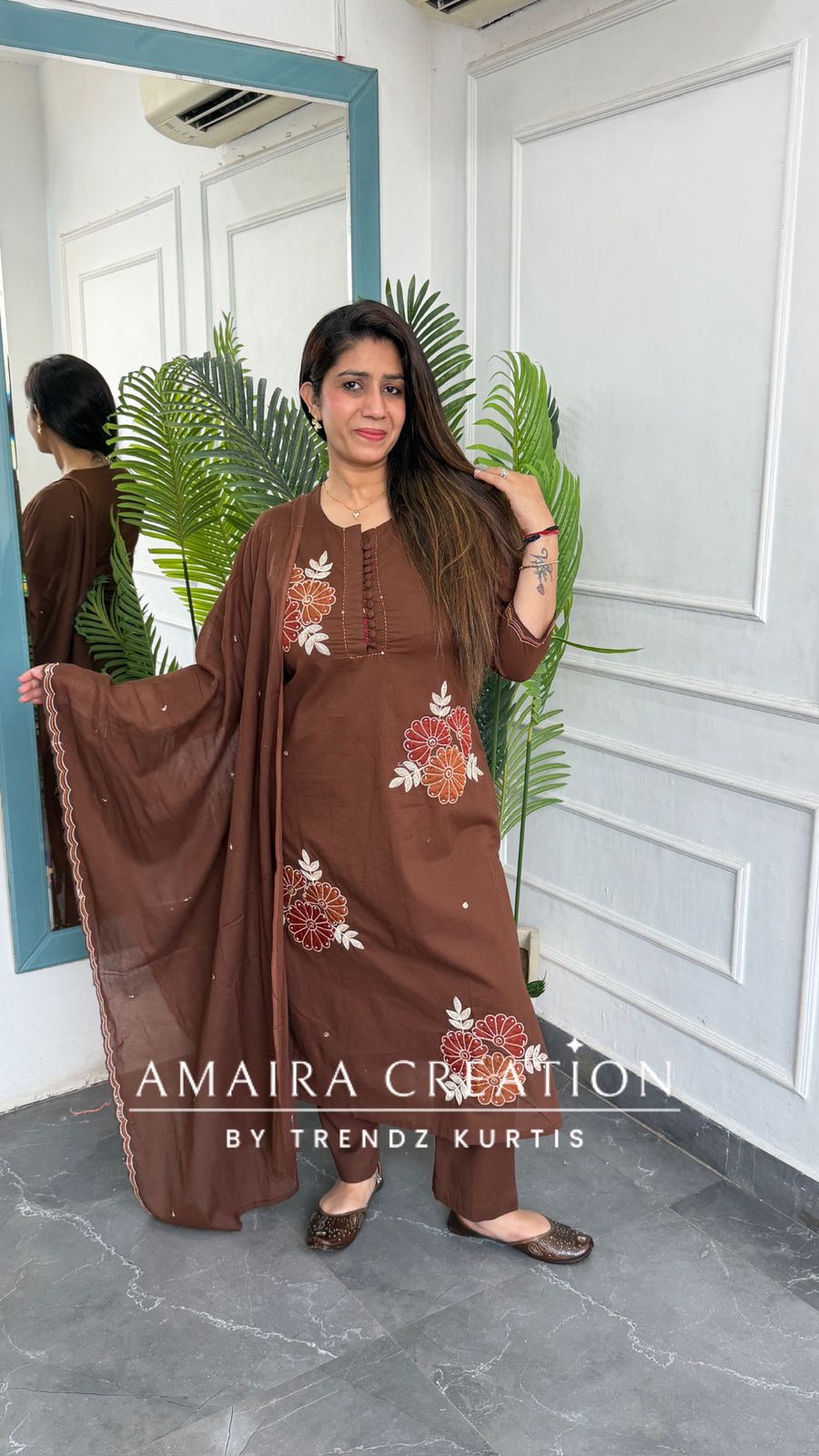Colour: A deep, rich Chocolate Brown base accented with ivory, peach, and rust floral embroidery.