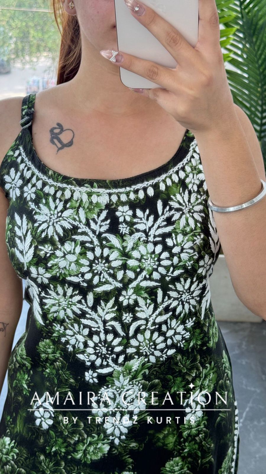 Design: A stunning botanical fusion featuring heavy white floral embroidery on the neckline that flows into a lush, forest-green leaf print. The sleeveless, straight-cut silhouette offers a modern, sharp look.