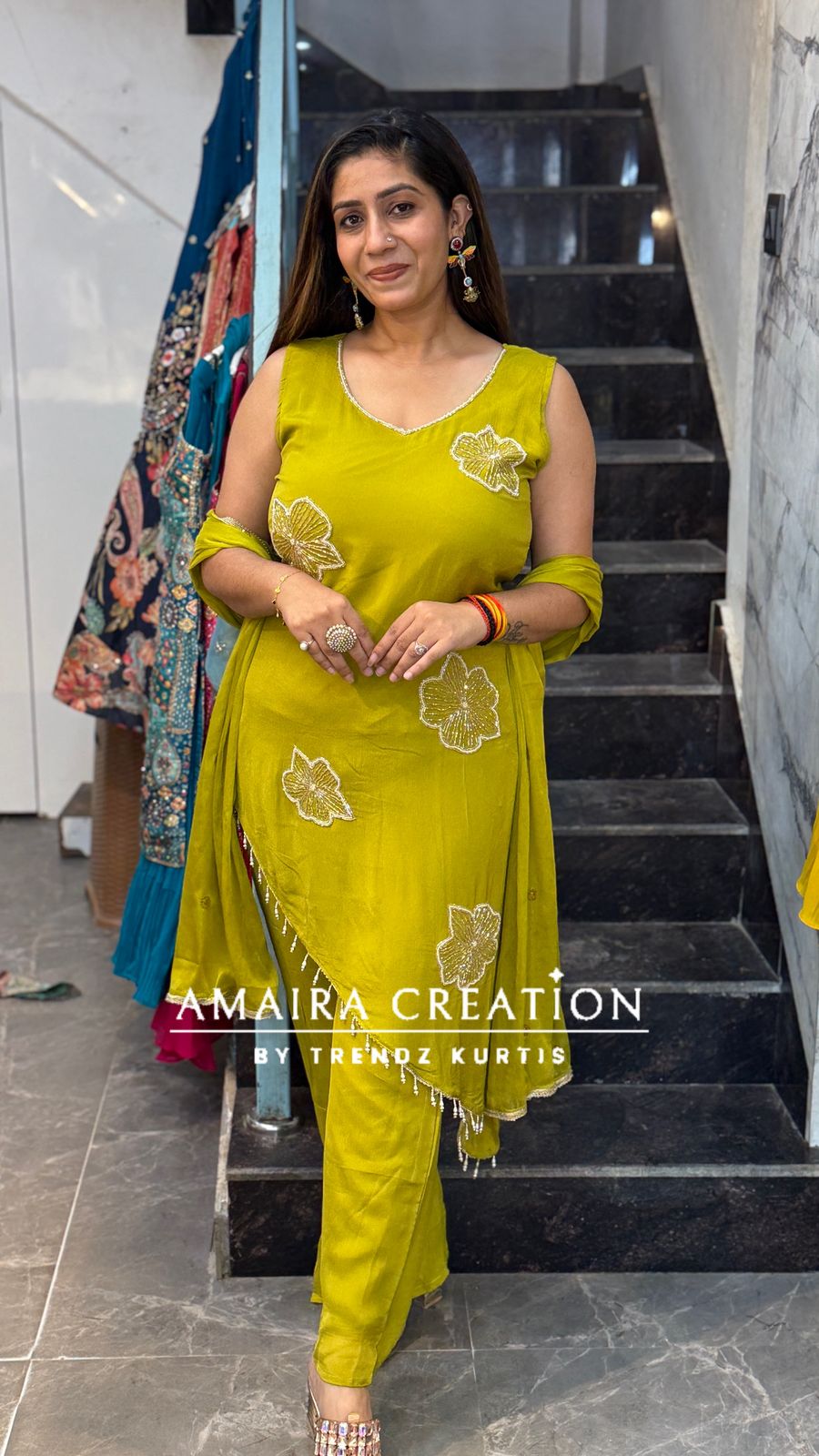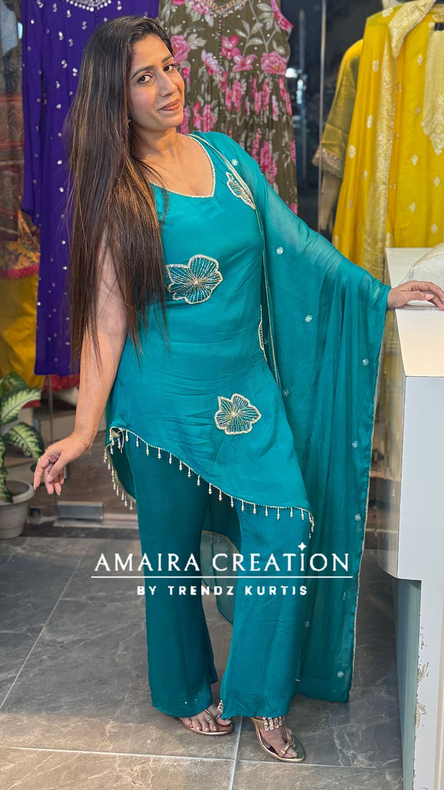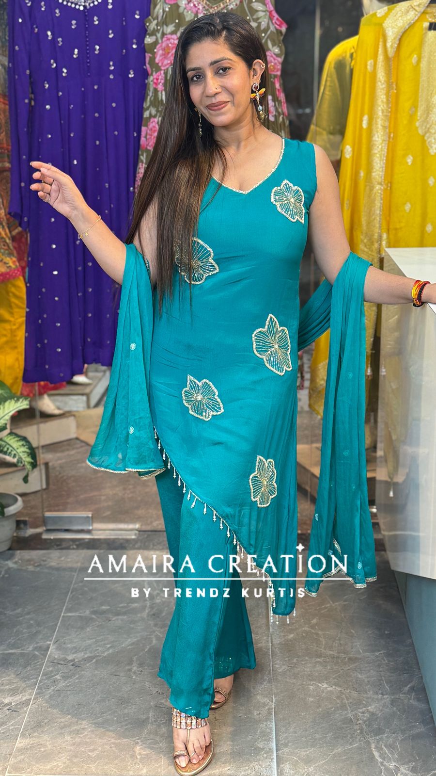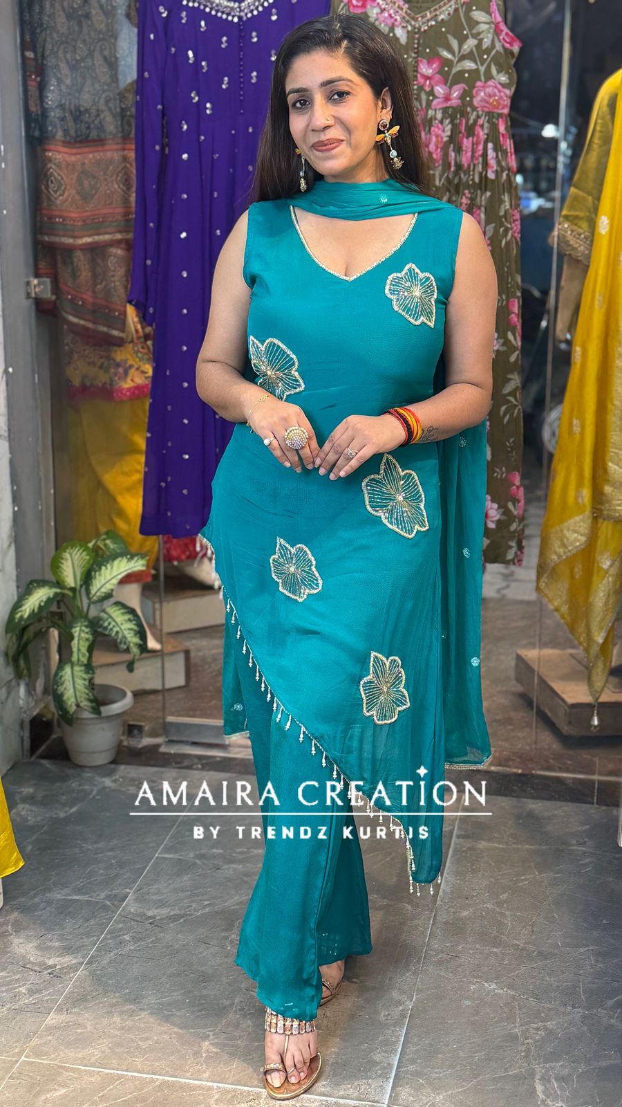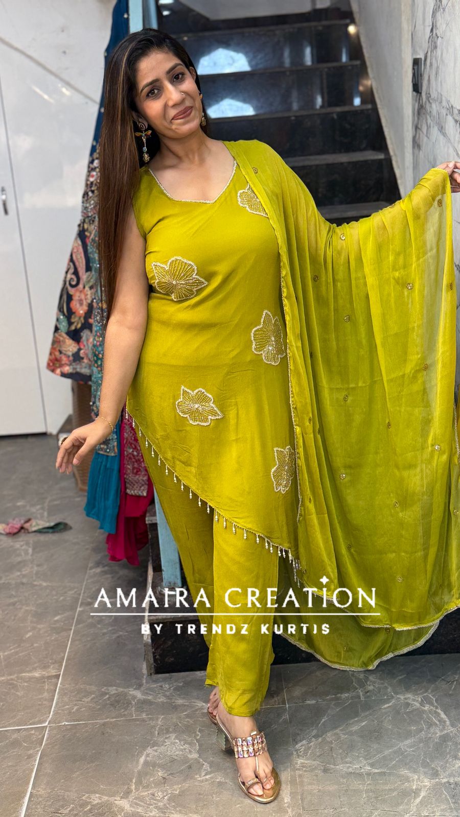 Kurti length 35 Inches (Approx) Pant length 37 Inches (Approx) Dry Clean Only *Disclaimer: Please note that minor color variations may arise due to varying screen resolutions.*