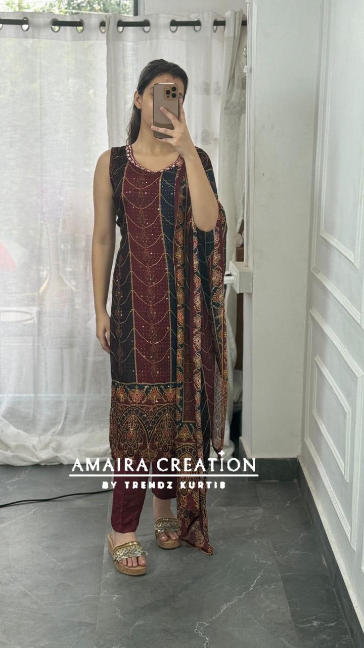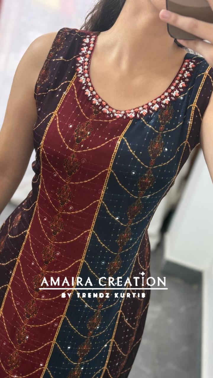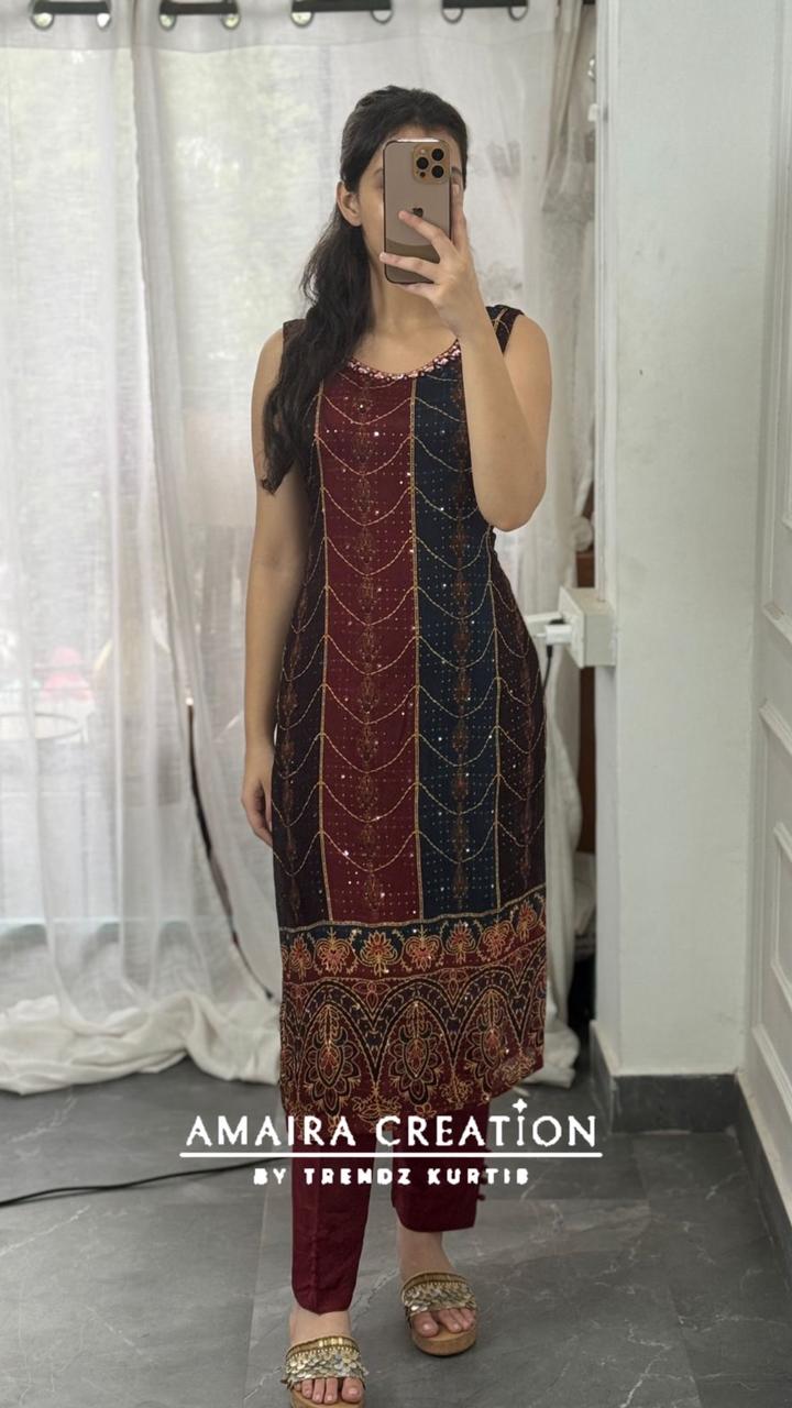 Premium Chinnon Maroon Blue Colour Pant Set( 17 inches sleeves available)