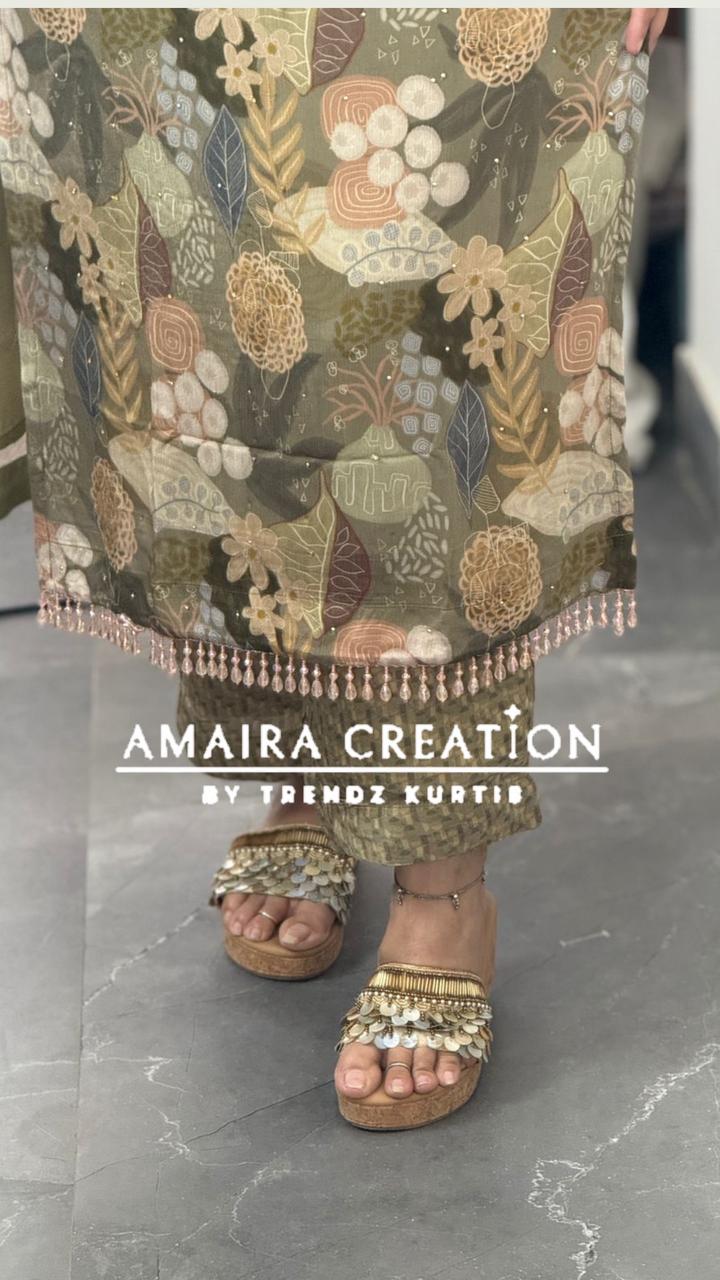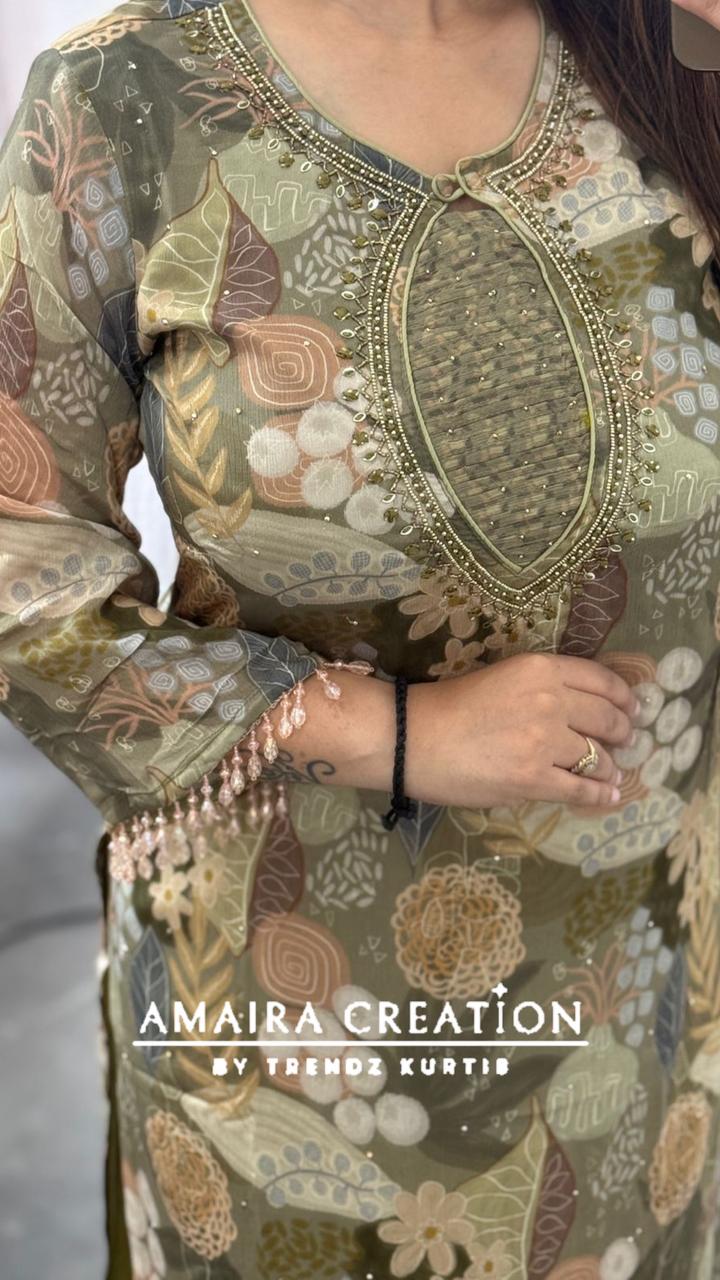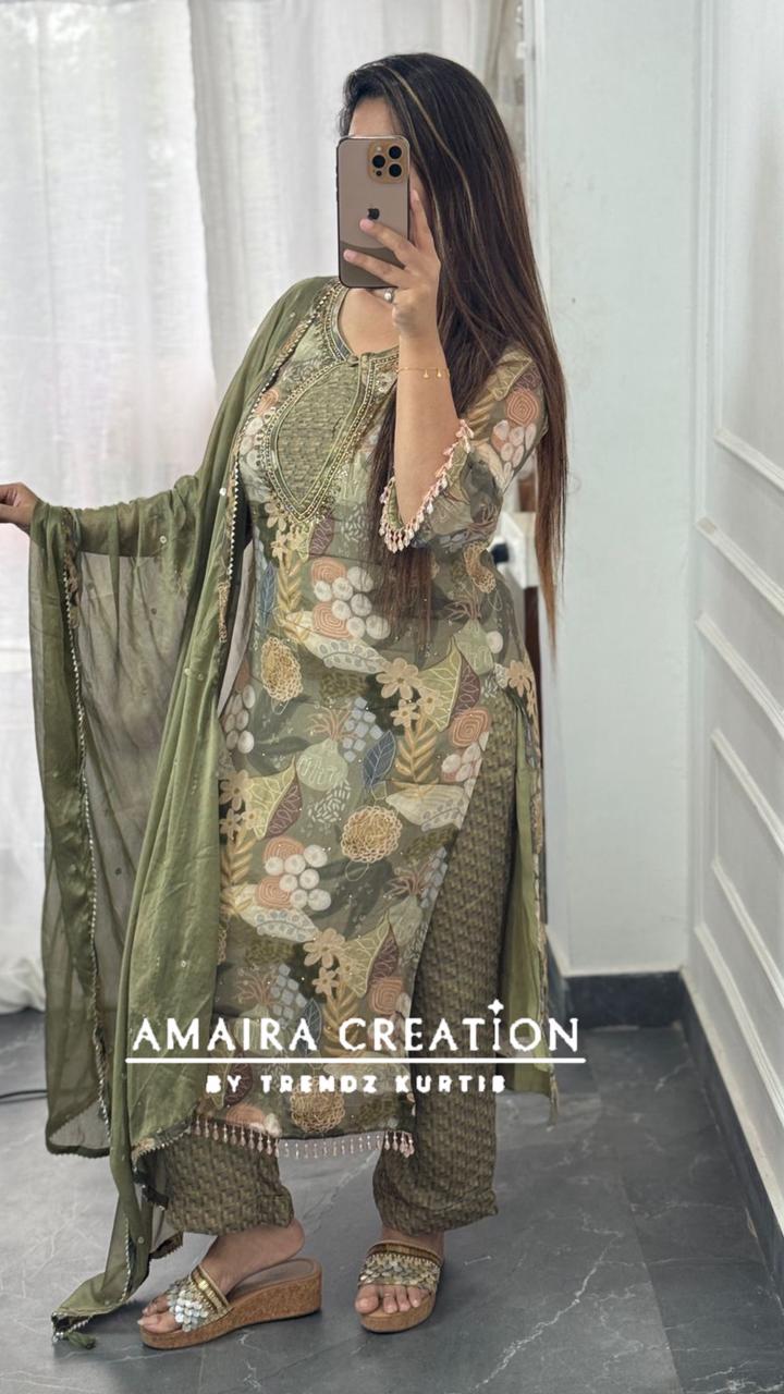Premium Chinnon Olive Green Pant Set With Beautiful Neck Detailing