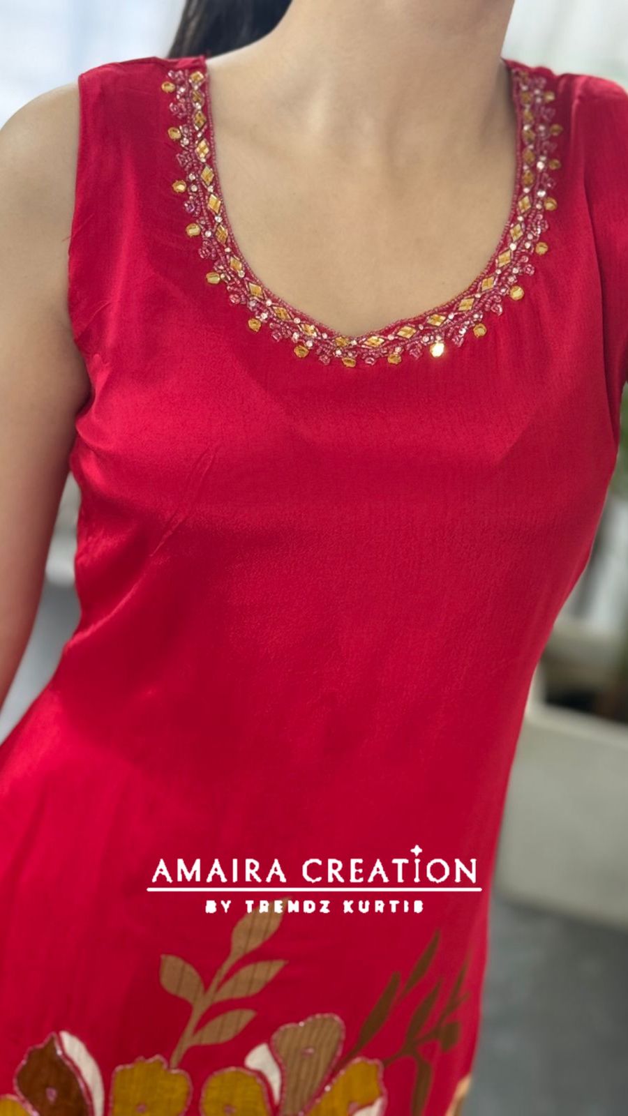 Premium Chinnon Red Floral print Pant Set(17 inches sleeves available)