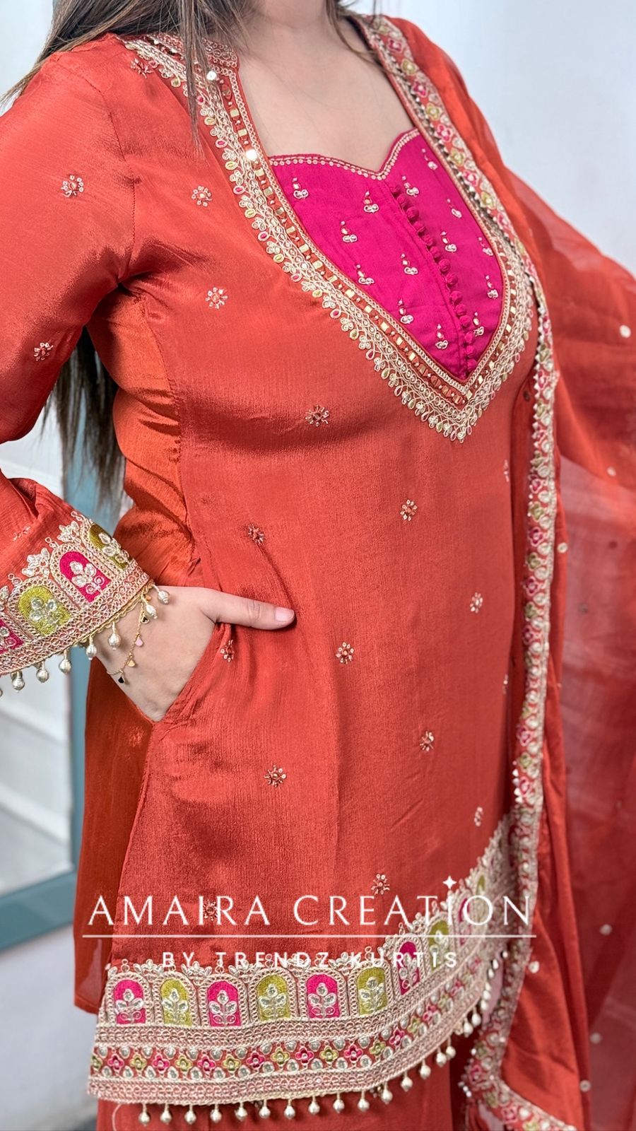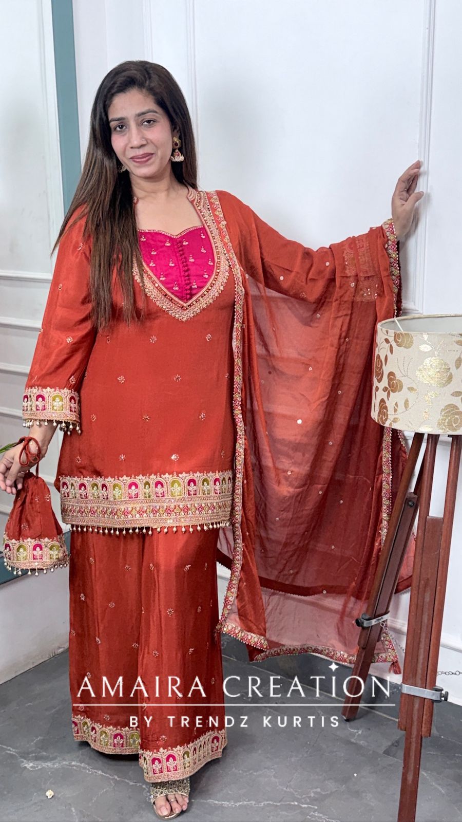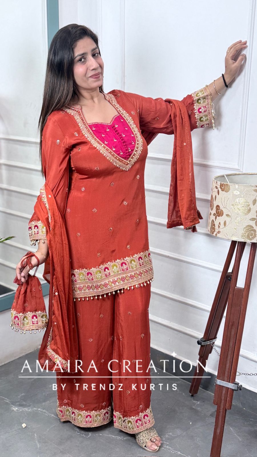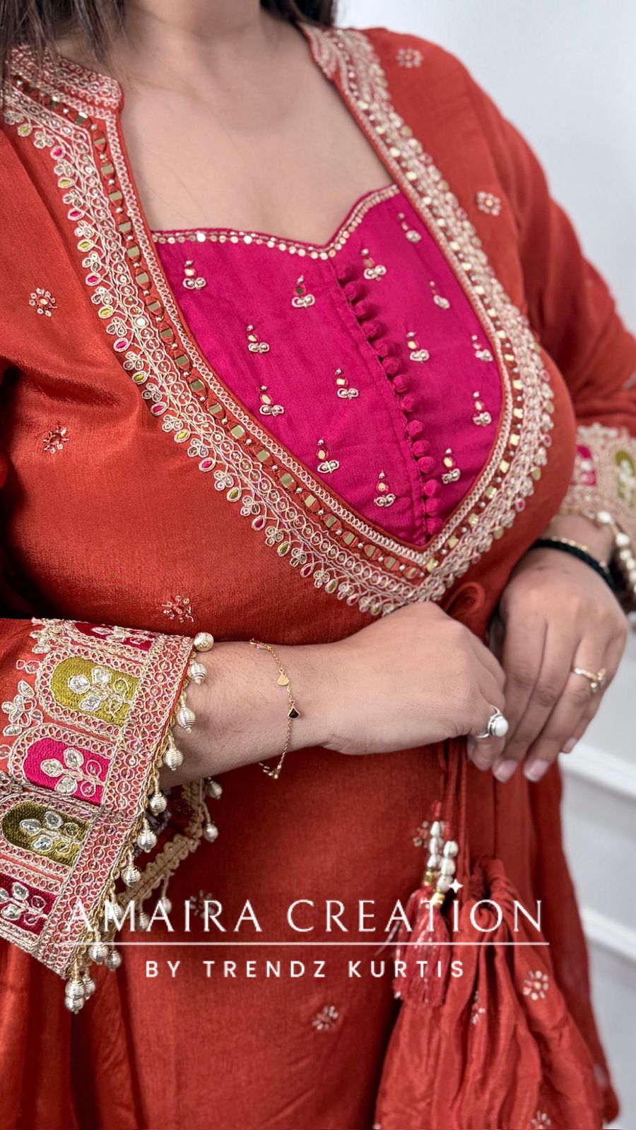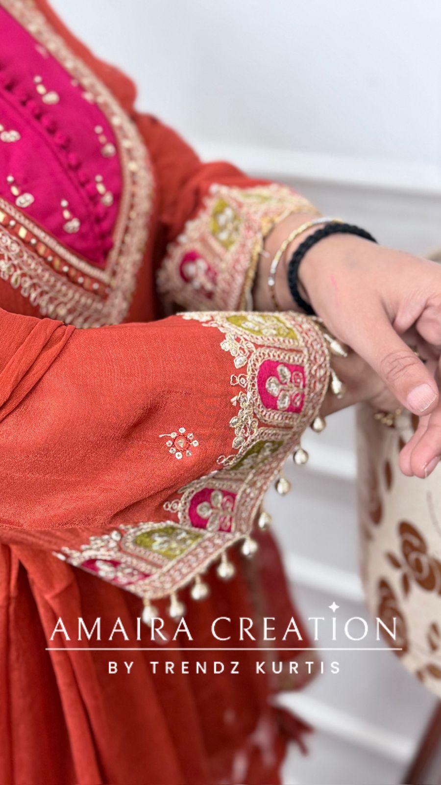 Premium Chinnon Rust Colour Burster Neck Design Full Ghera Divider Set
