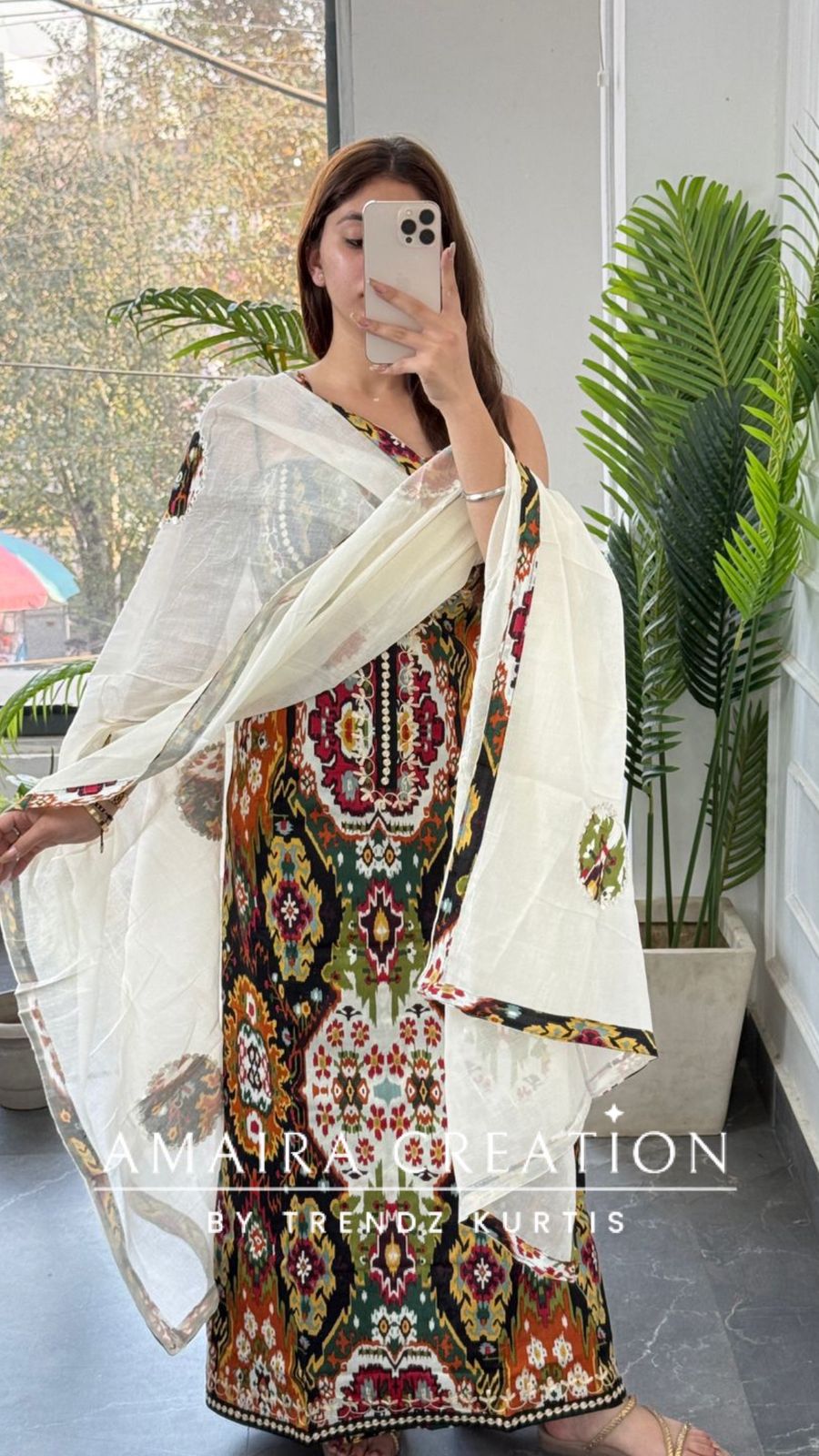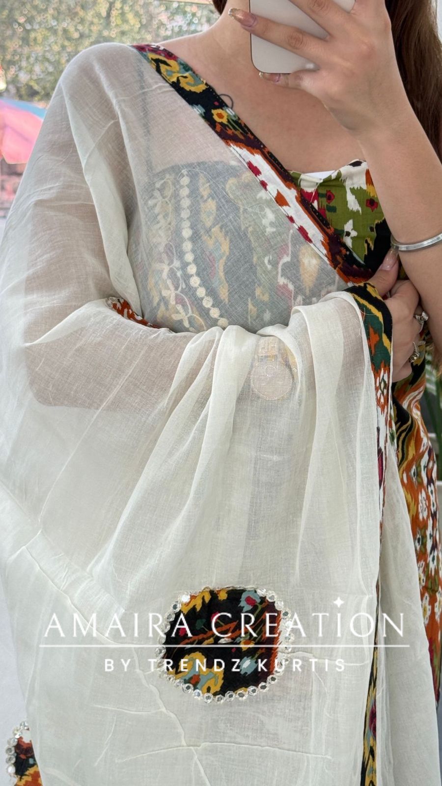 - Design: Bold all-over Patola-inspired ikat print with a detailed yoke and sequin accents, paired with a contrast dupatta featuring matching circular motifs..