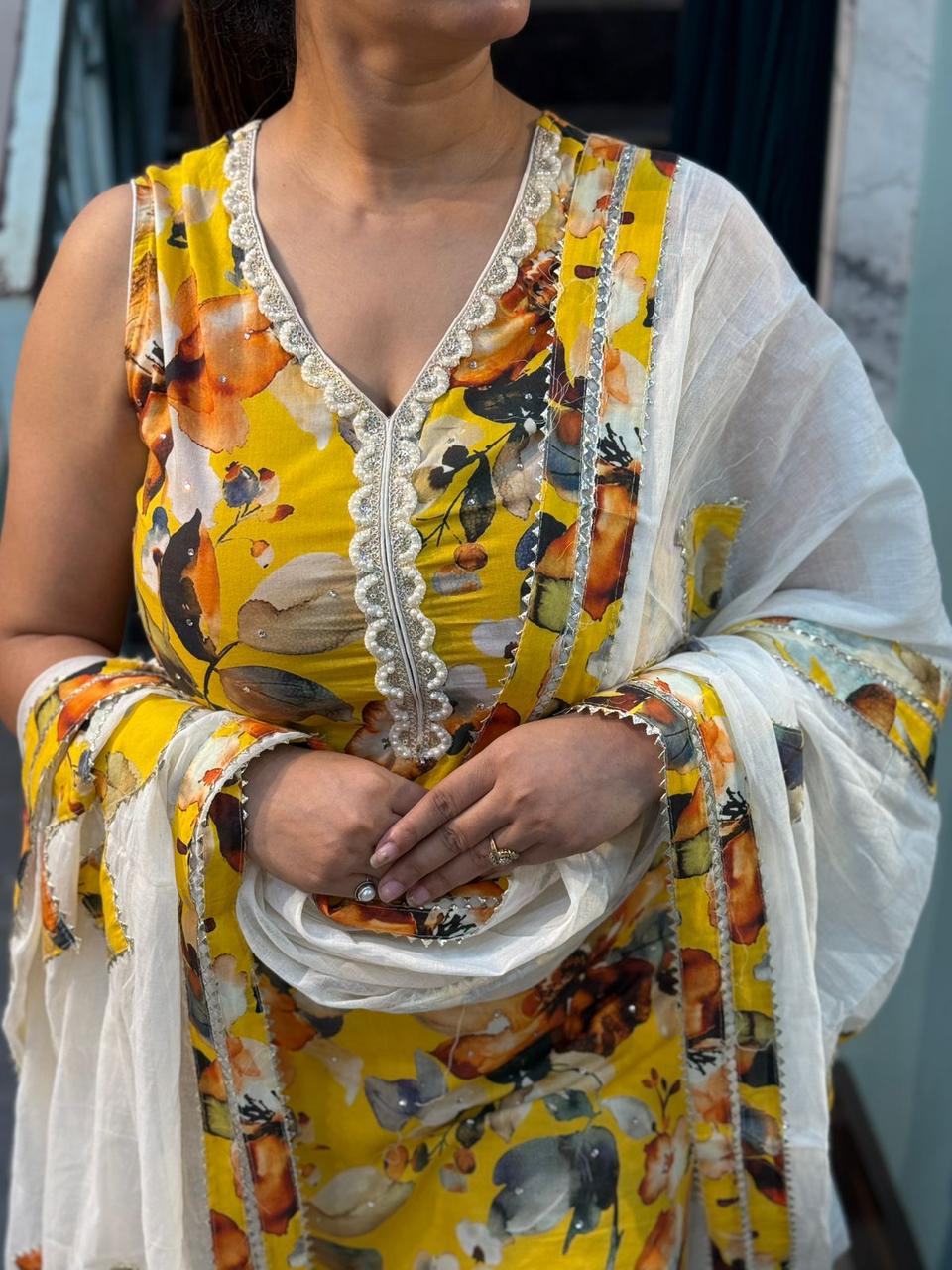 Premium Cotton Sea Shells Detailing Yellow Suit with Beautiful Dupaata(17inches sleeves available)