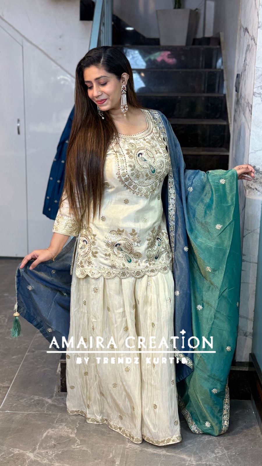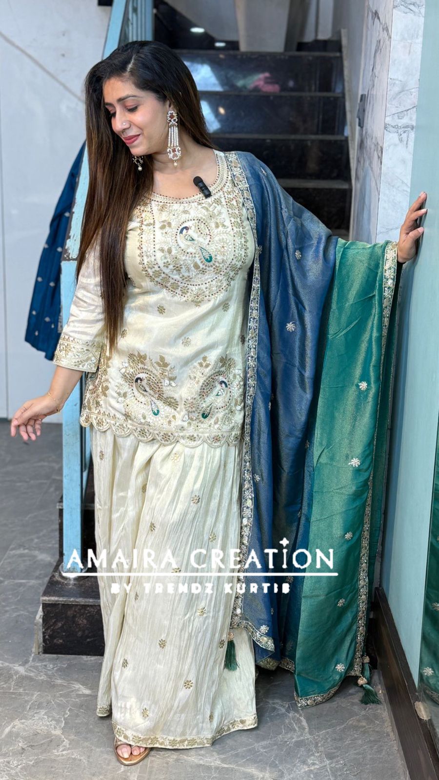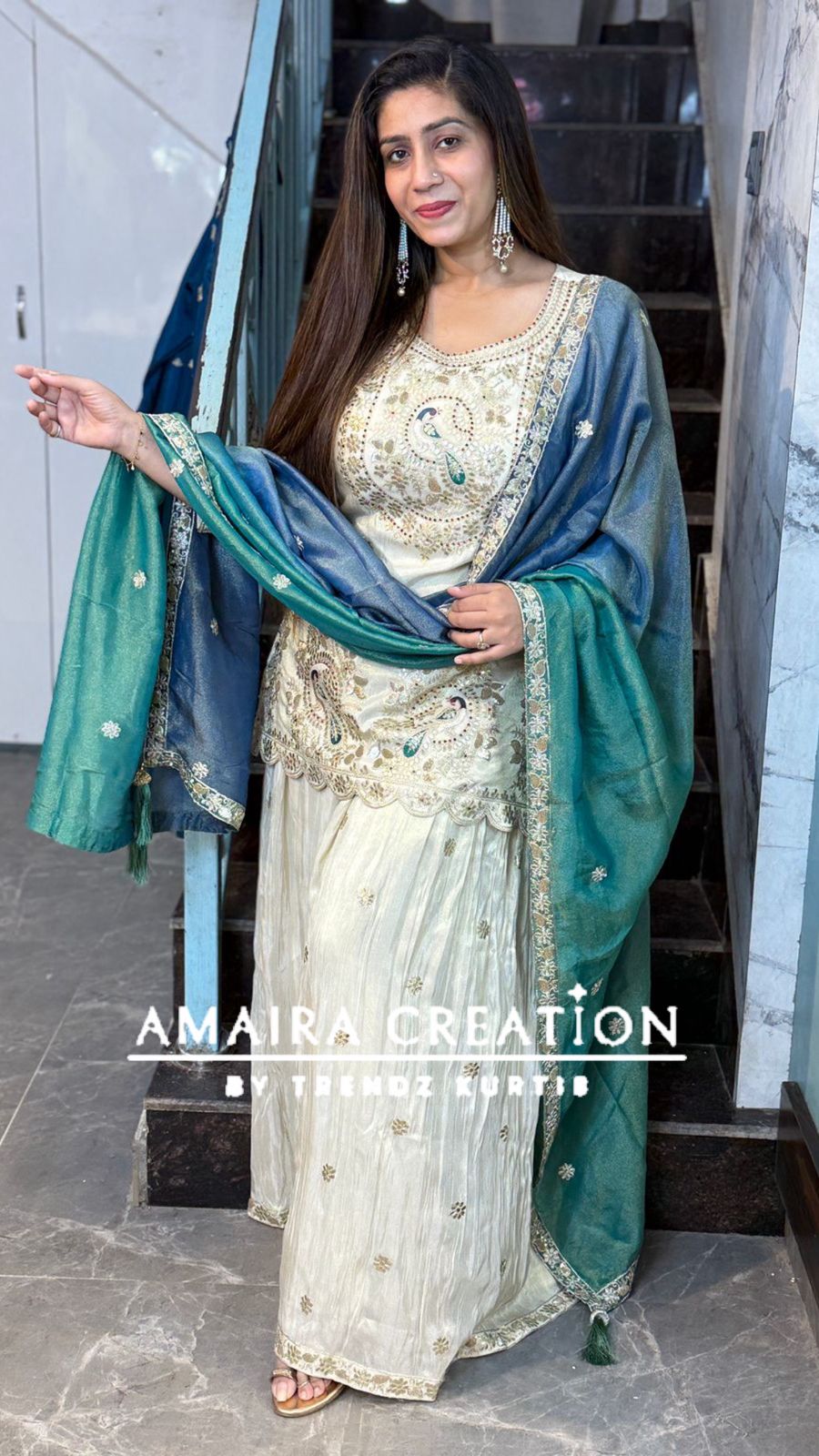 Kurti length 31 Inches (Approx) Ghera Plazo length 43 Inches (Approx) Dry Clean Only *Disclaimer: Please note that minor color variations may arise due to varying screen resolutions.*