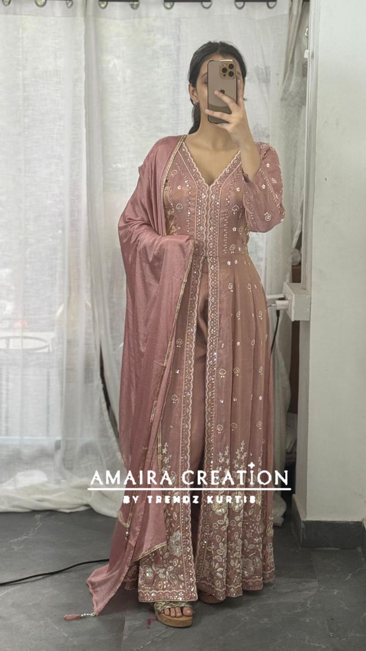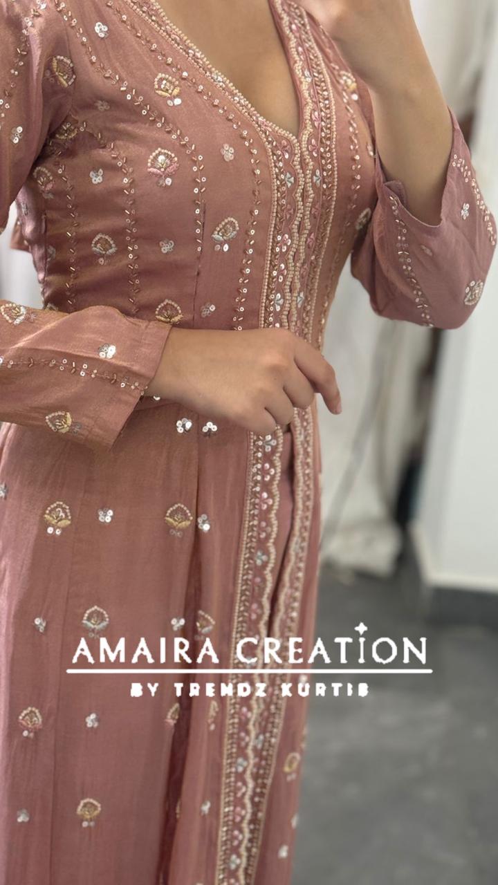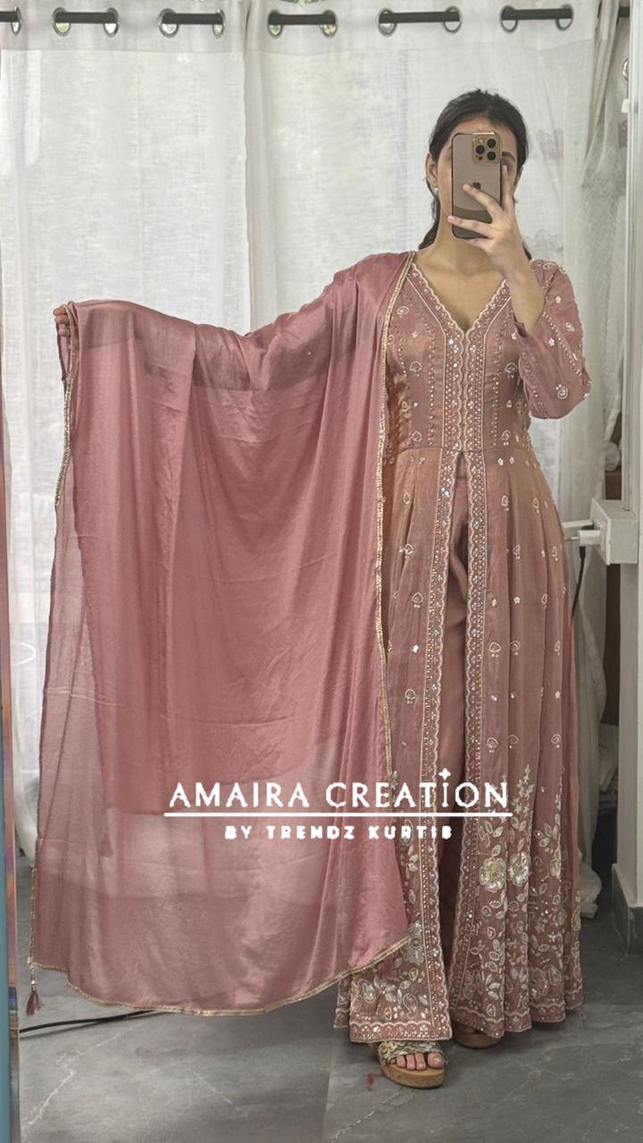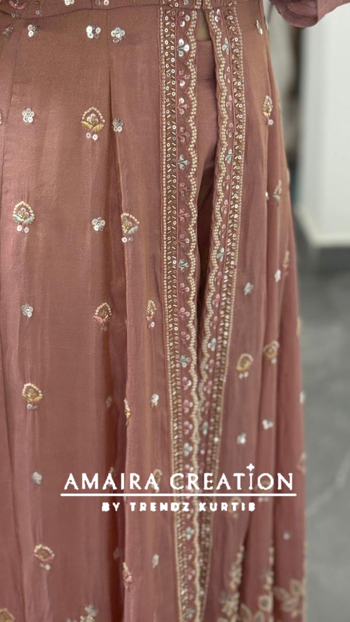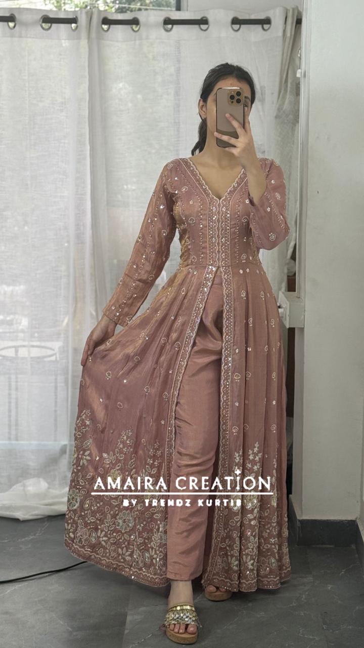 Premium Glass Tissue Mauve Color Full Work Centre Slit Pant Set
