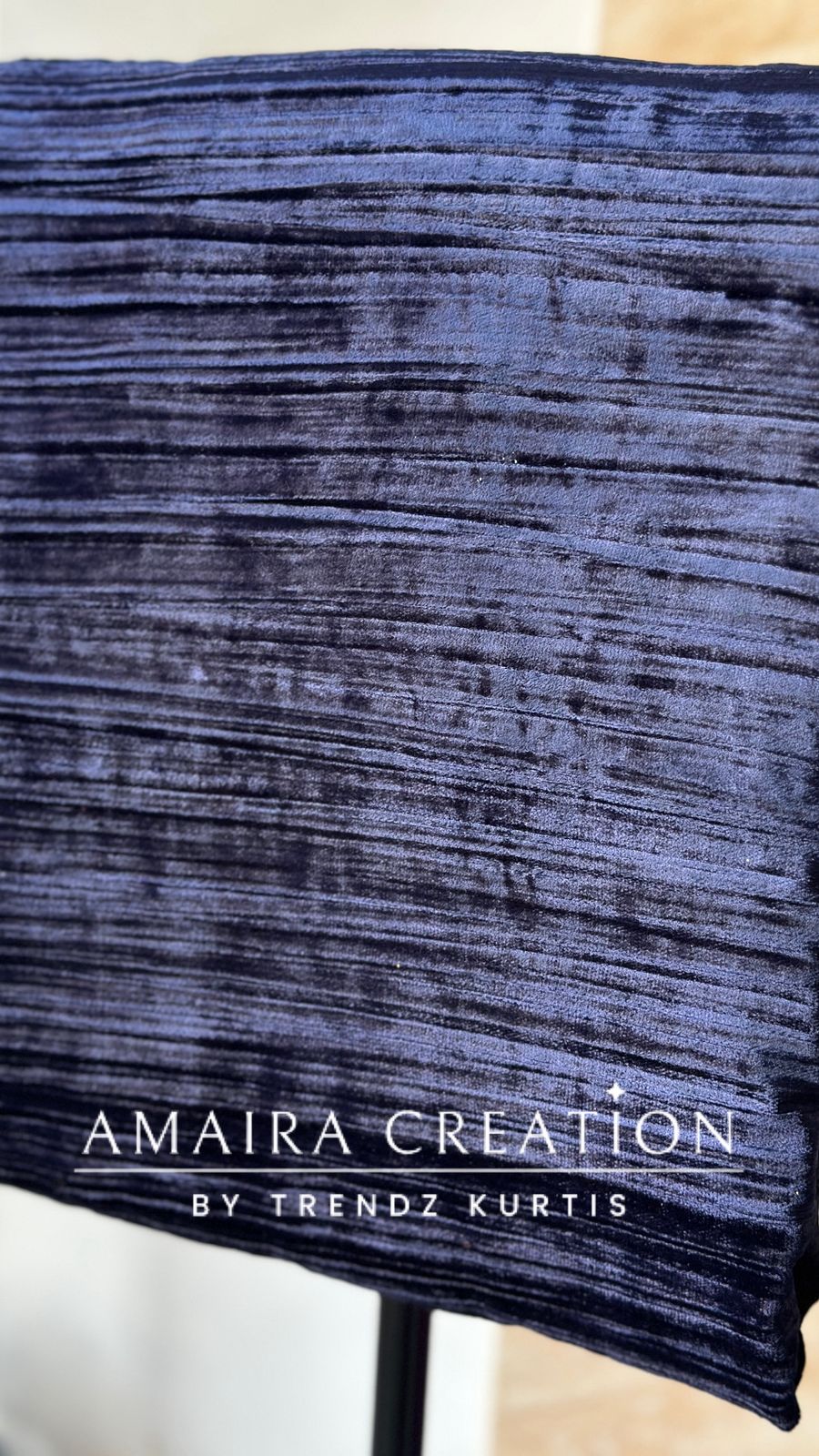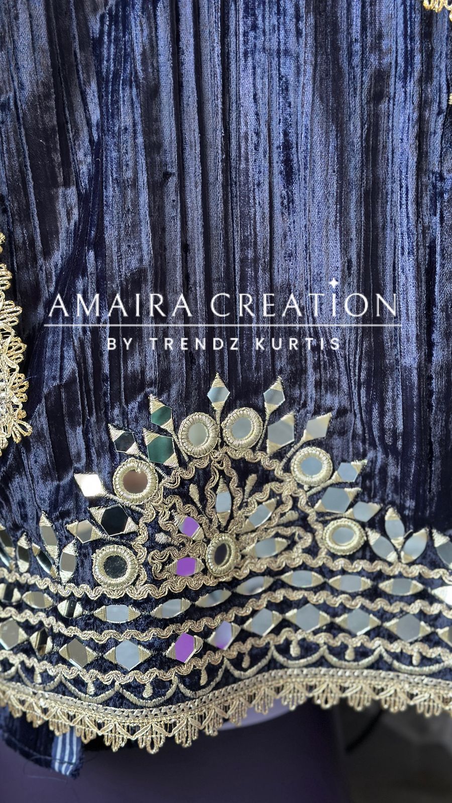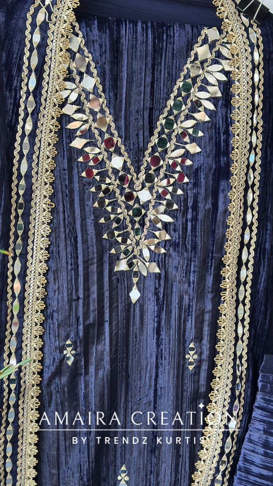 Premium Navy Blue Crush Velvet Original Mirror & Zari Unstitch Set