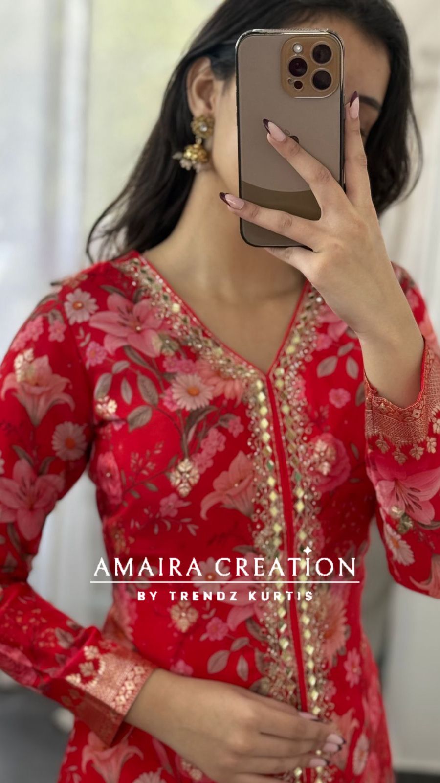 Premium Organza Red Colour Short Kurti With Flare Georgette Divider Set