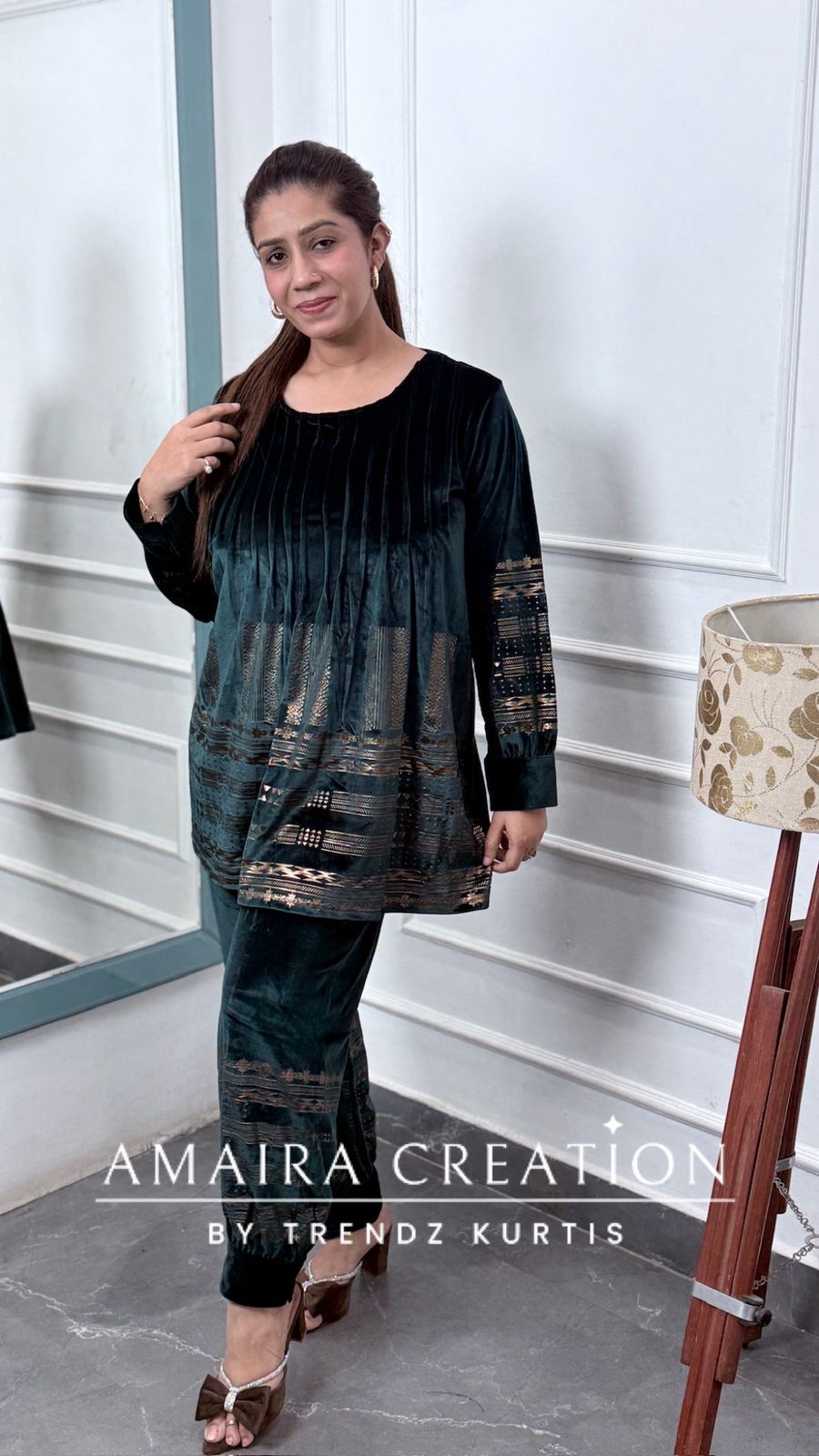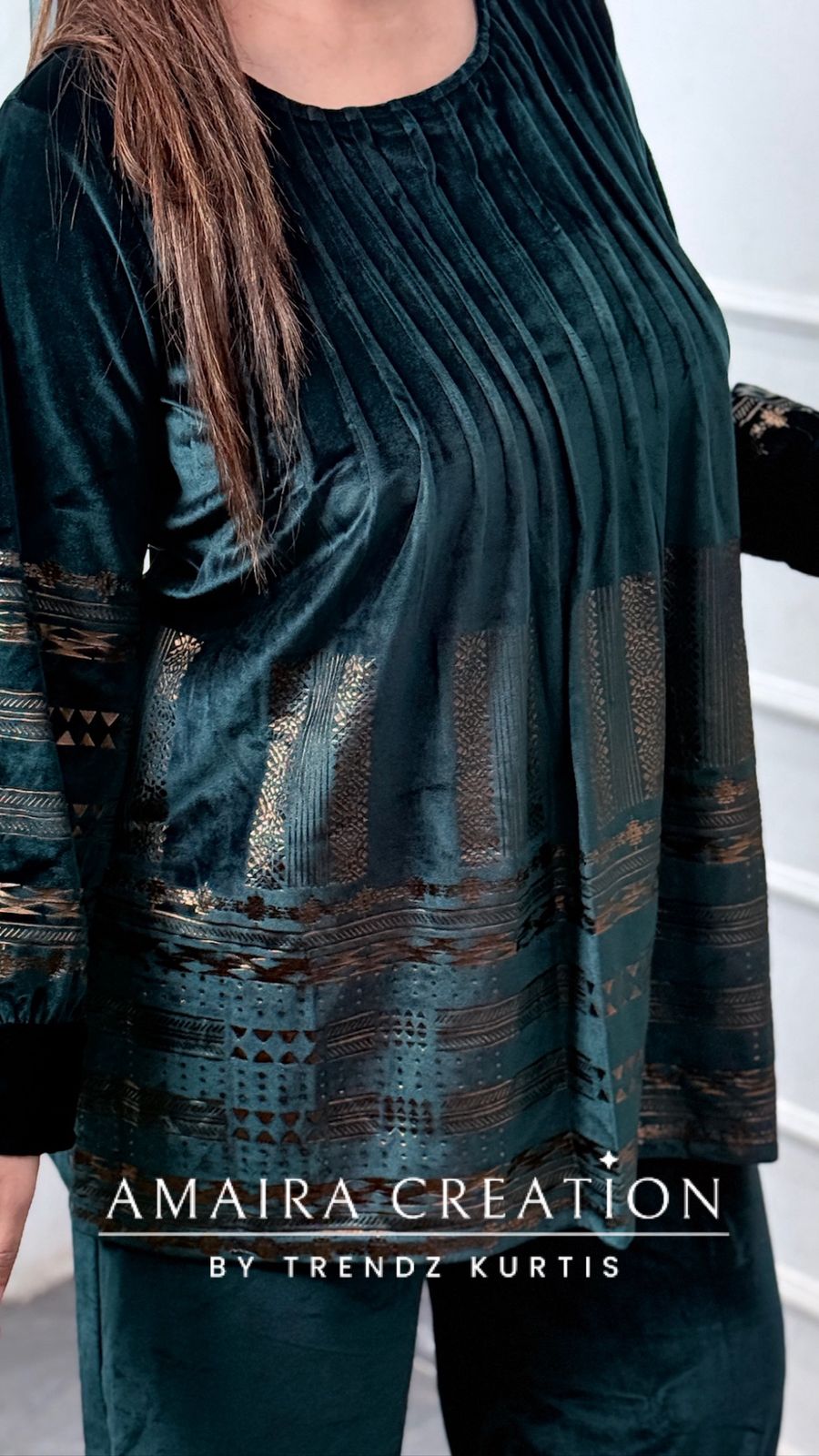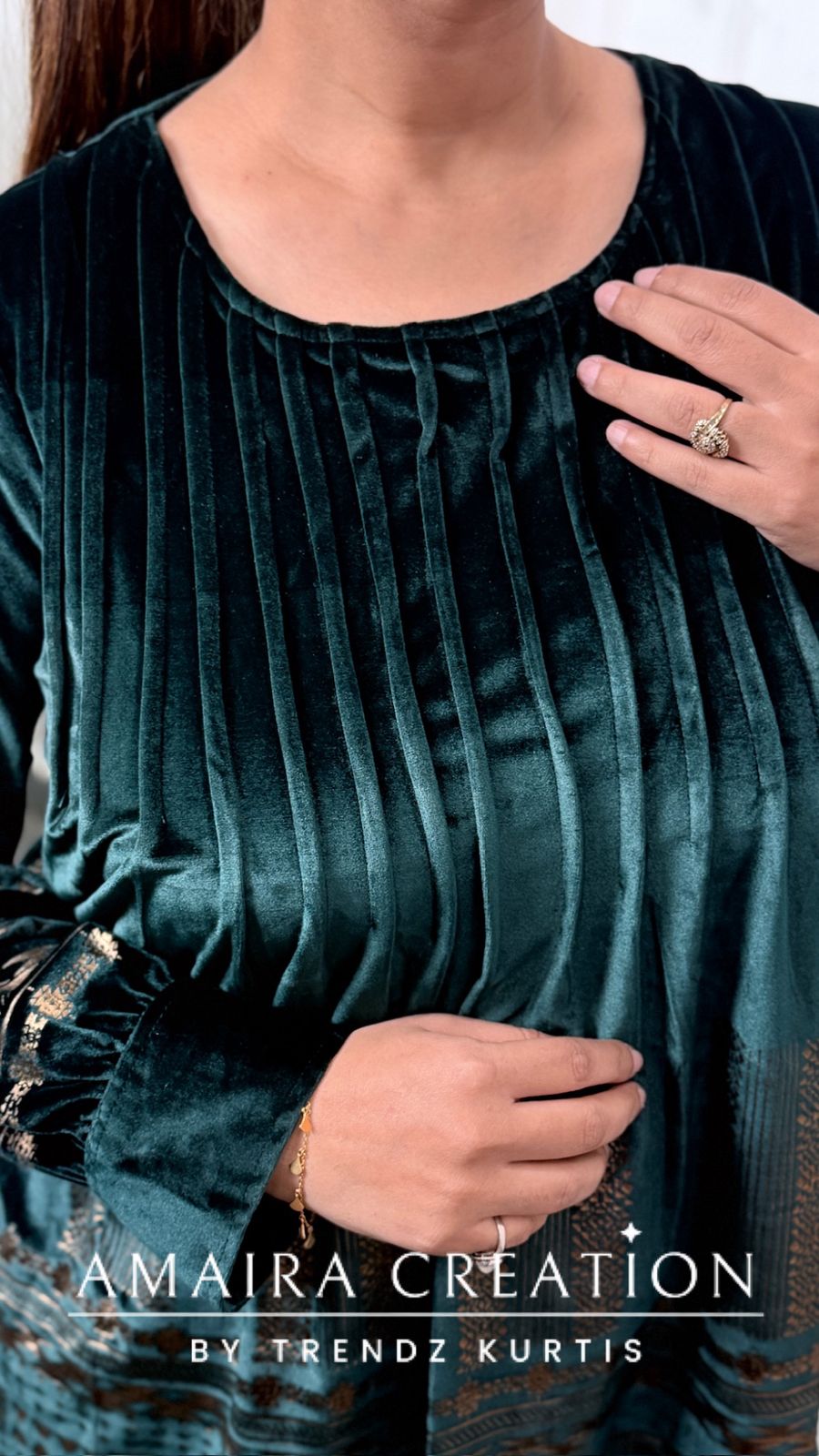 Premium Velvet Peacock Green Color Pintuck Afghani Pant Cord Set