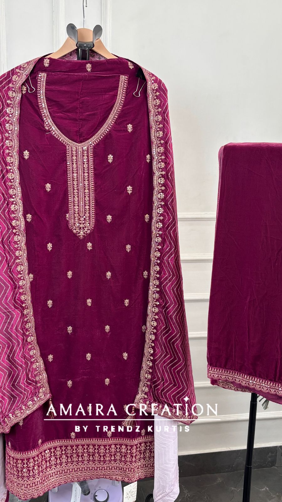 Premium Velvet Very Soft Fabric Zari Work Unstitched Suit With Printed Velvet Dupatta