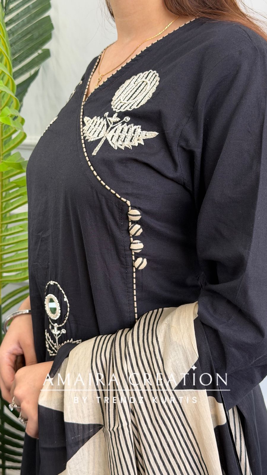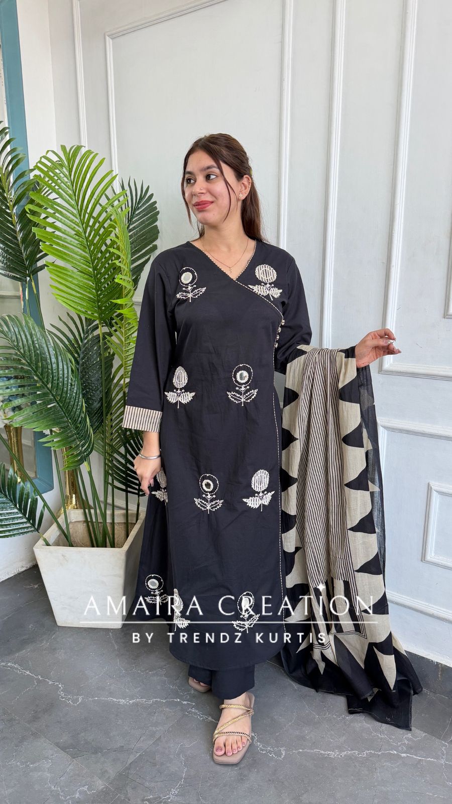 Design: A sophisticated Angrakha-style kurta featuring a surplice V-neckline with delicate embroidery and mirror-work accents. The outfit is adorned with white ethnic motifs and a striking geometric-patterned dupatta that balances the bold black base.