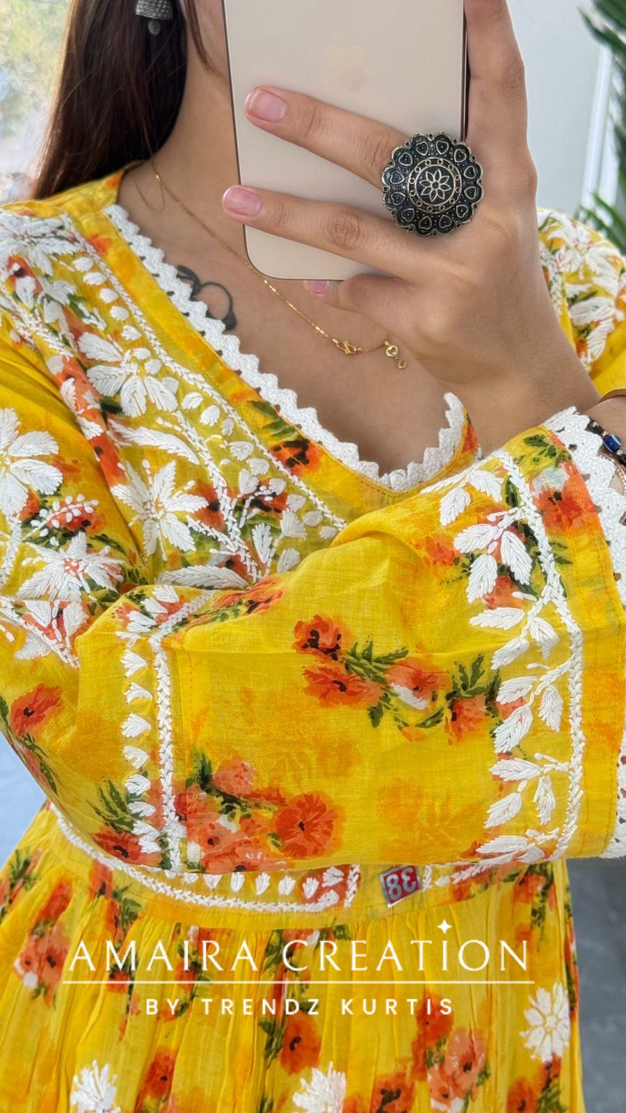 - Colour: Vibrant Yellow with multi-colored floral prints and white lace accents..