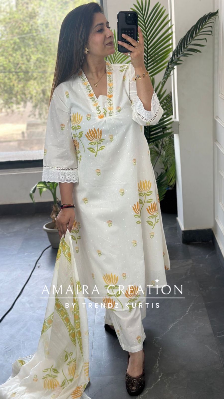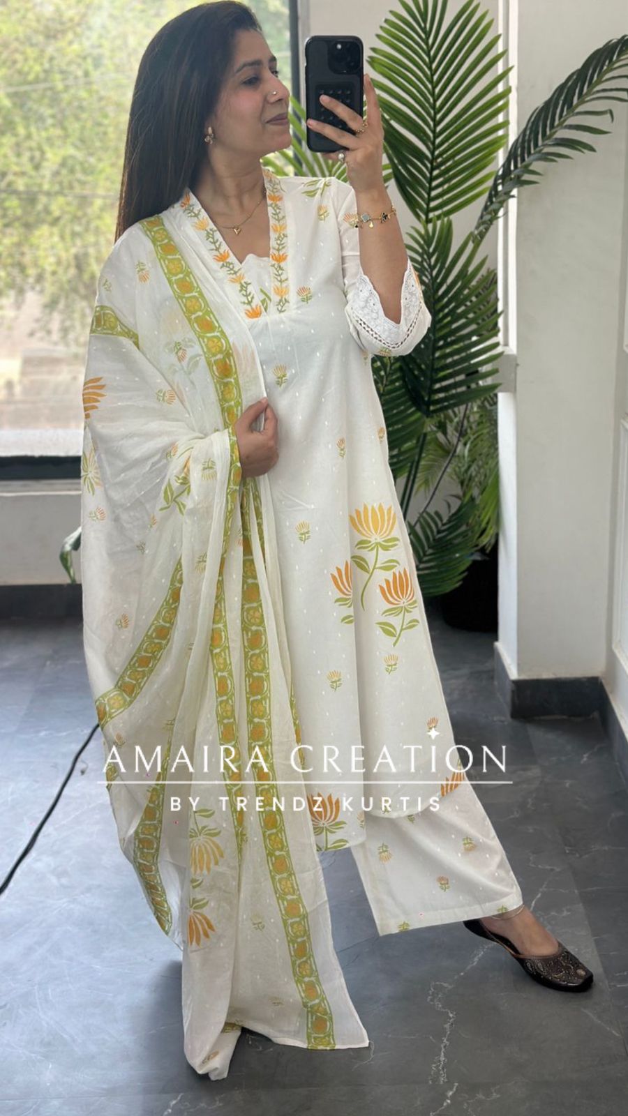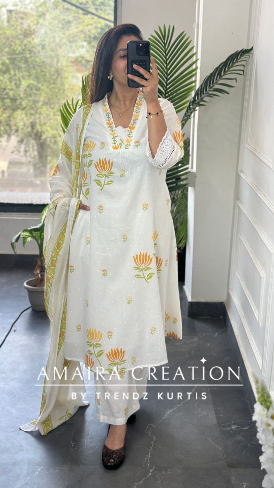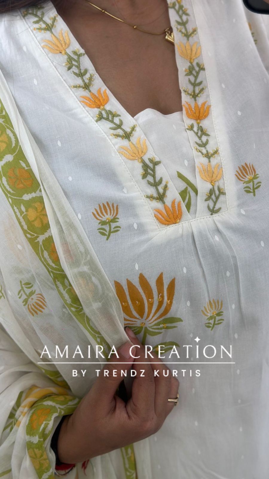Design: This elegant white ensemble features a classic V-neckline with delicate floral embroidery and lace detailing on the sleeves. The outfit is adorned with mustard and olive green floral motifs and comes with a coordinating dupatta that features a matching border for a cohesive look
