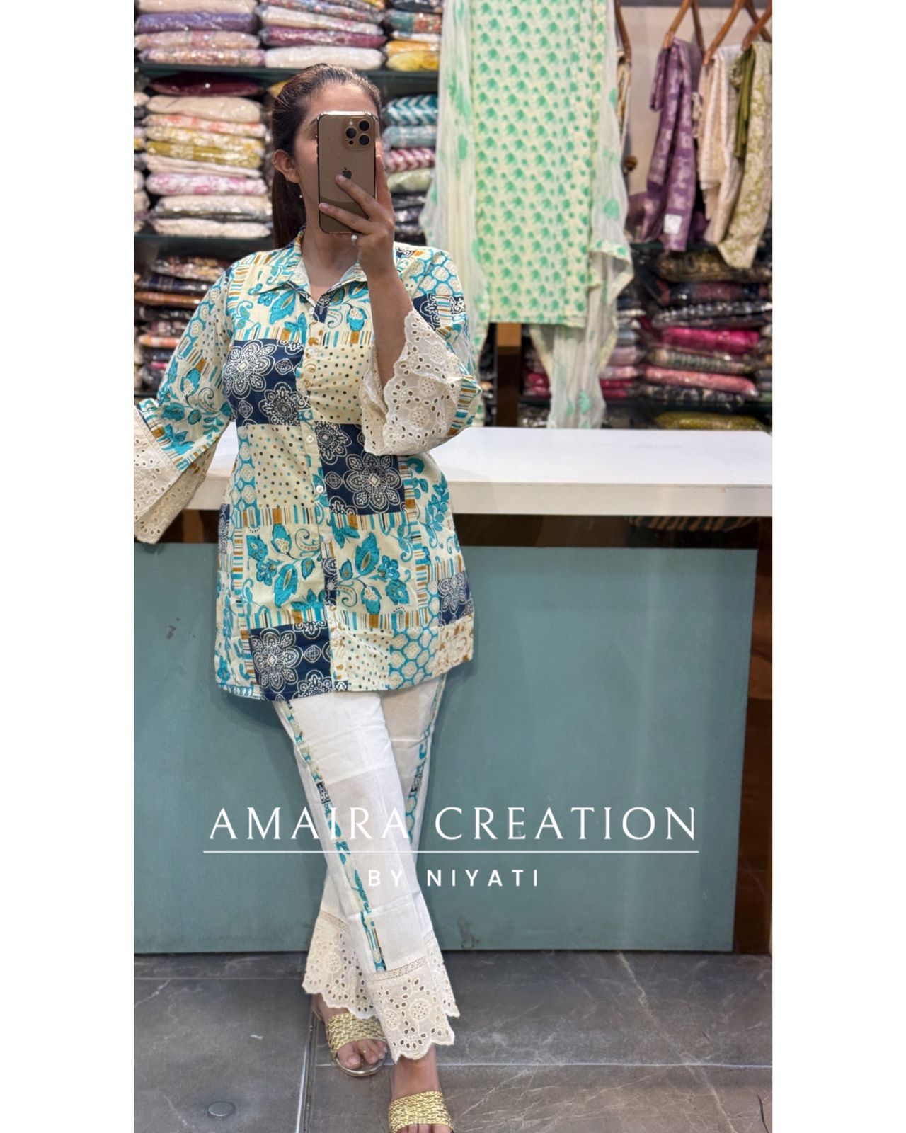 White And Blue Cotton Coord Set With Schiffli detailing Plazo